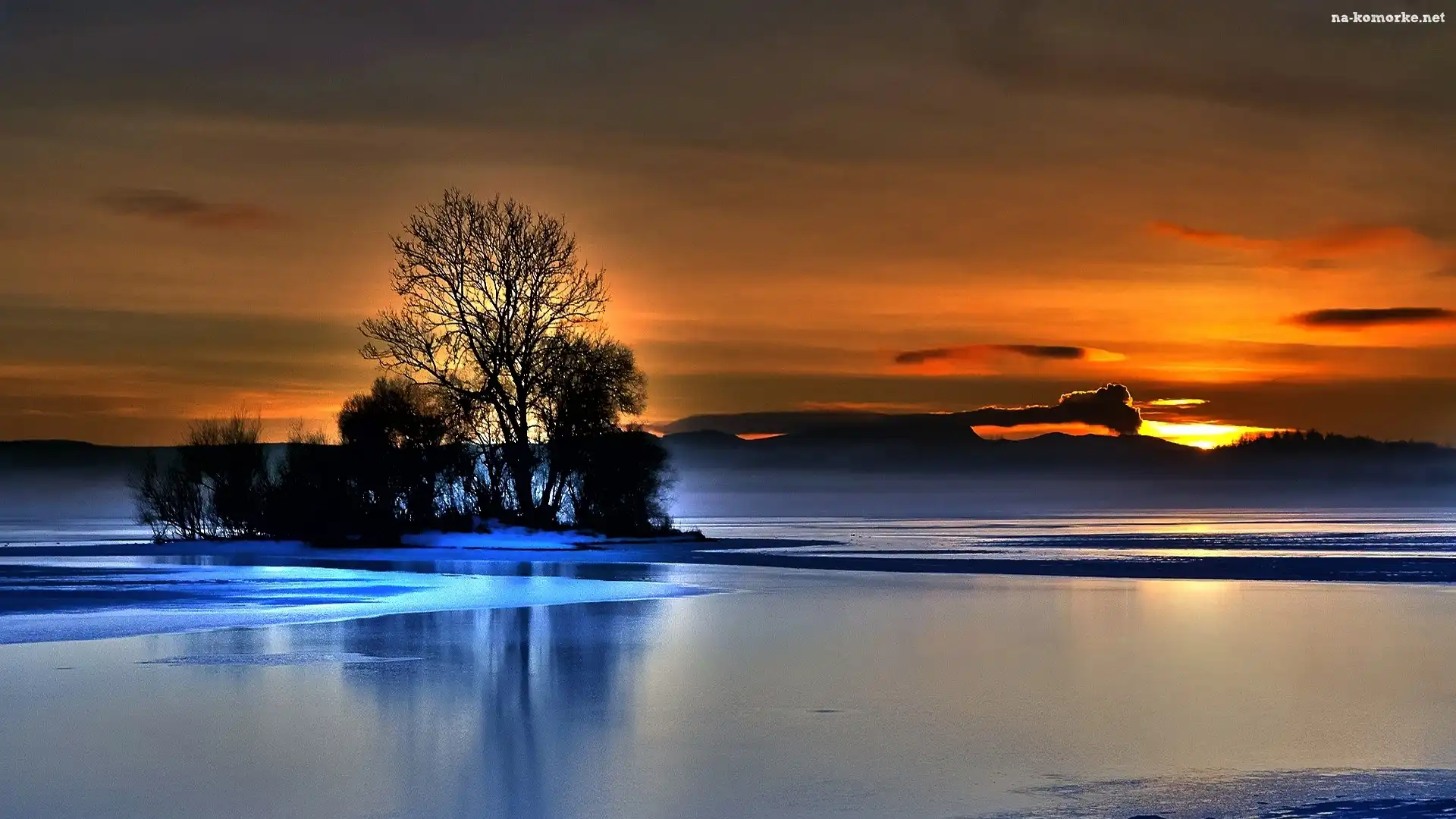 Słońca, Rozlewiska, Wyspa, Drzewa, Zachód na Komórkę