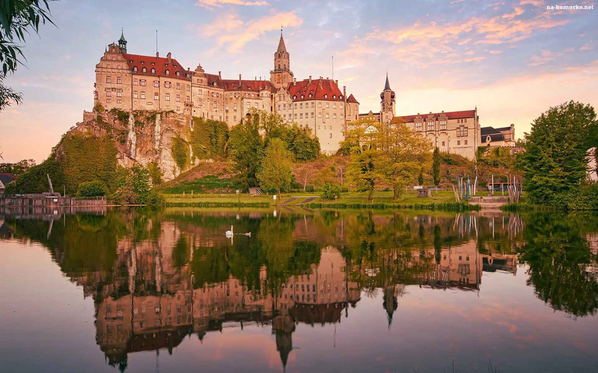 Niemcy, Zachód słońca, Rzeka Dunaj, Drzewa, Zamek Sigmaringen, Łabędzie, Niebo, Chmury na Komórkę