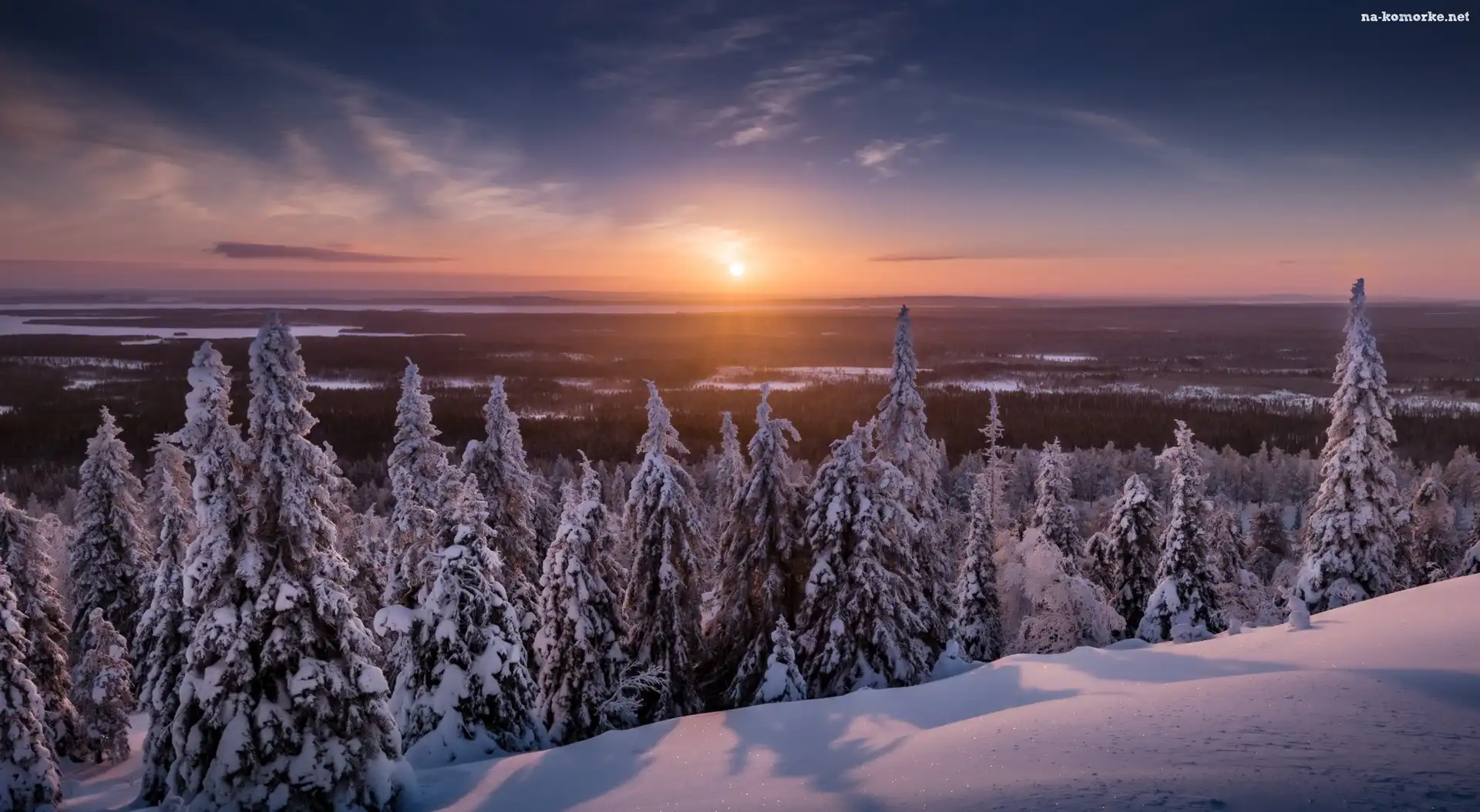 Finlandia, Świerki, Gmina Posio, Zachód słońca, Laponia, Park Narodowy Riisitunturi, Zima, Drzewa na Komórkę |