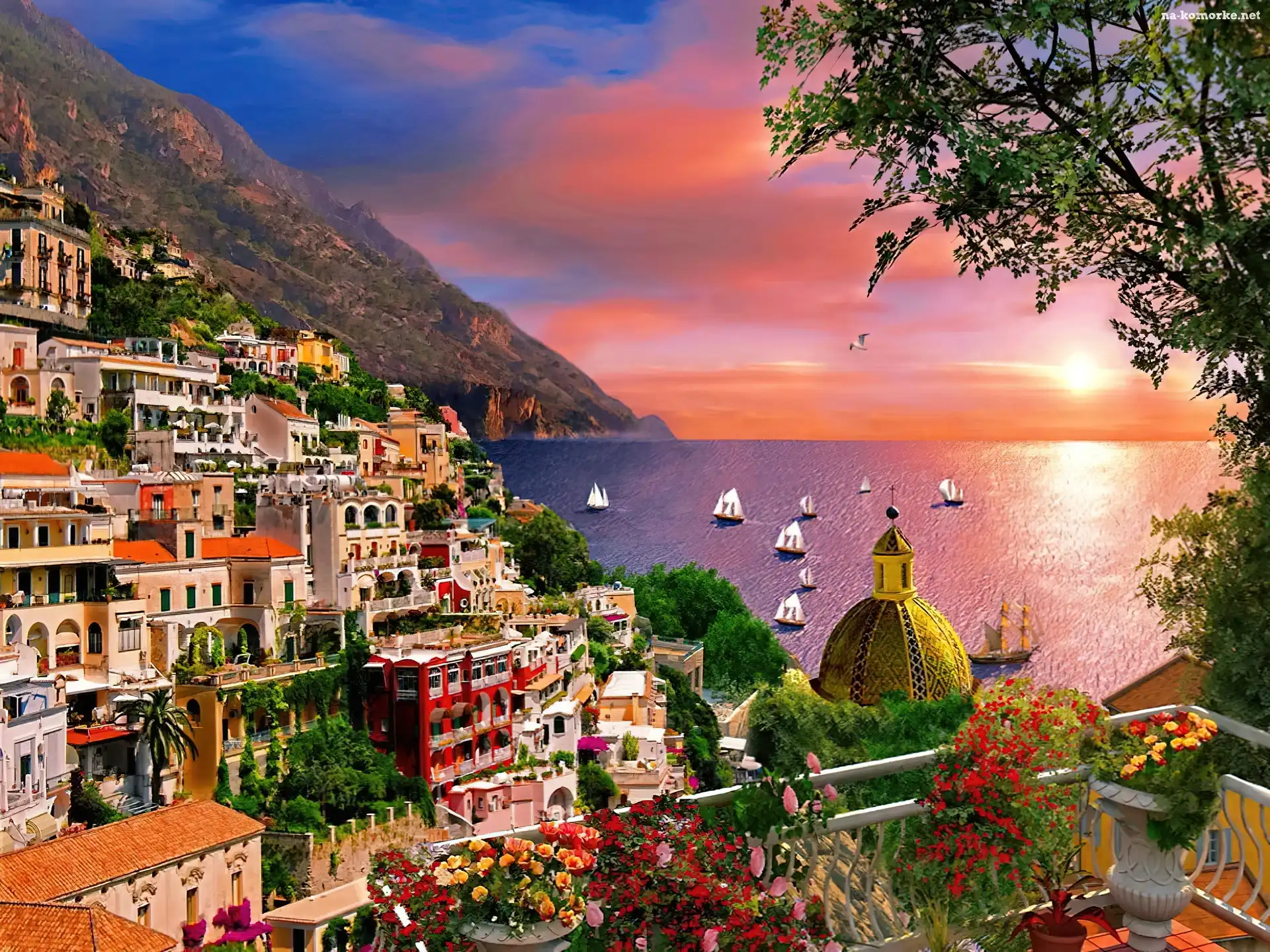 Słońca, Domy, Morze, Góra, Zachód na Komórkę