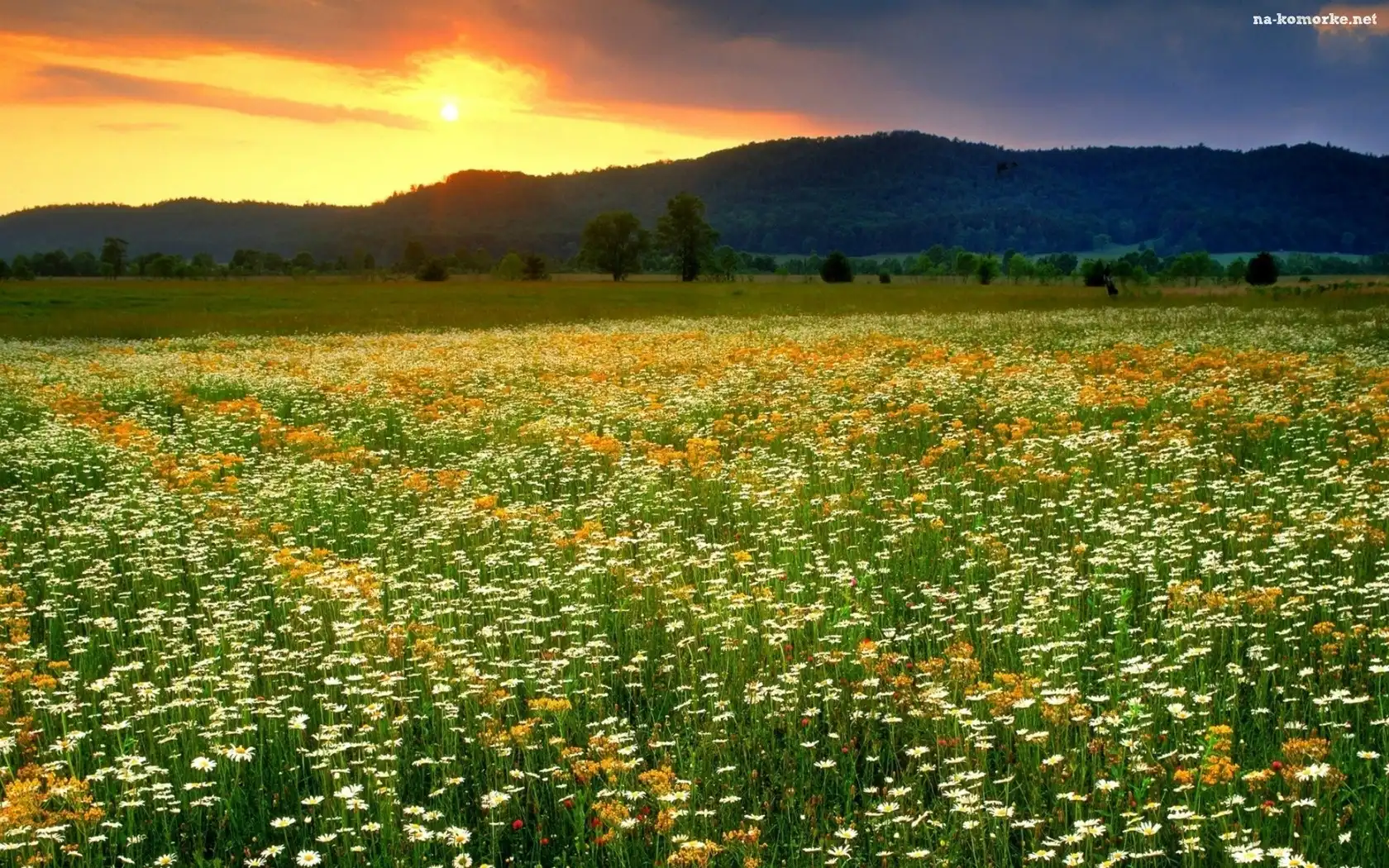 Słońca, Łąka, Kwiaty, Góry, Zachód na Komórkę