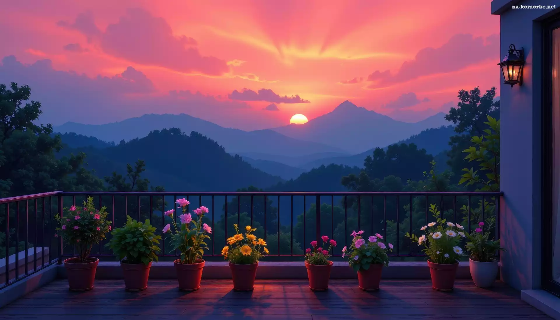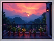 Kwiaty, Balkon, Zachód słońca, Doniczki, Góry na Komórkę