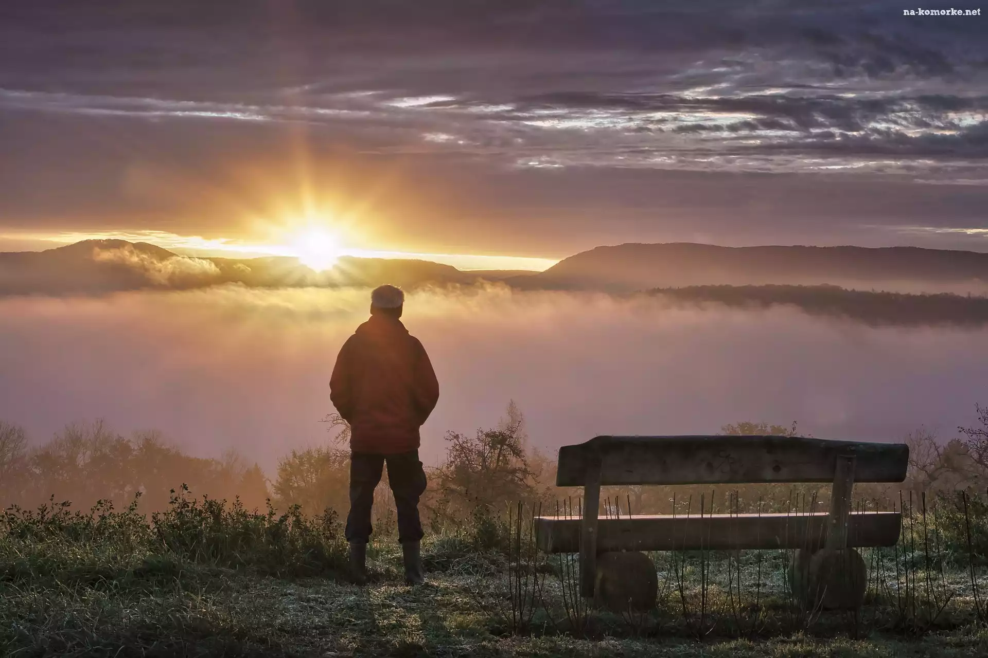 Mgła, Ławka, Zachód słońca, Człowiek, Góry na Komórkę