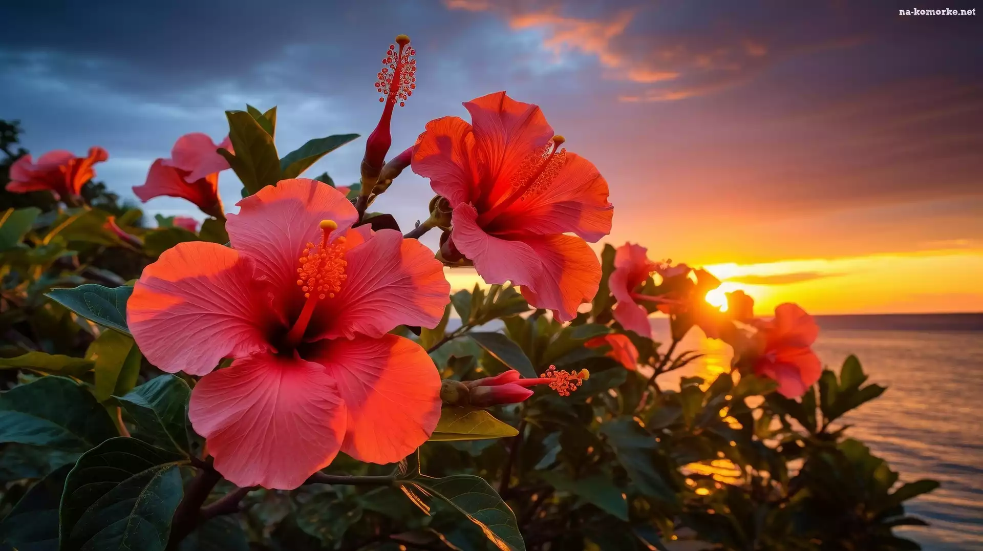 Hibiskusy, Morze, Zachód słońca, Kwiaty, Grafika na Komórkę