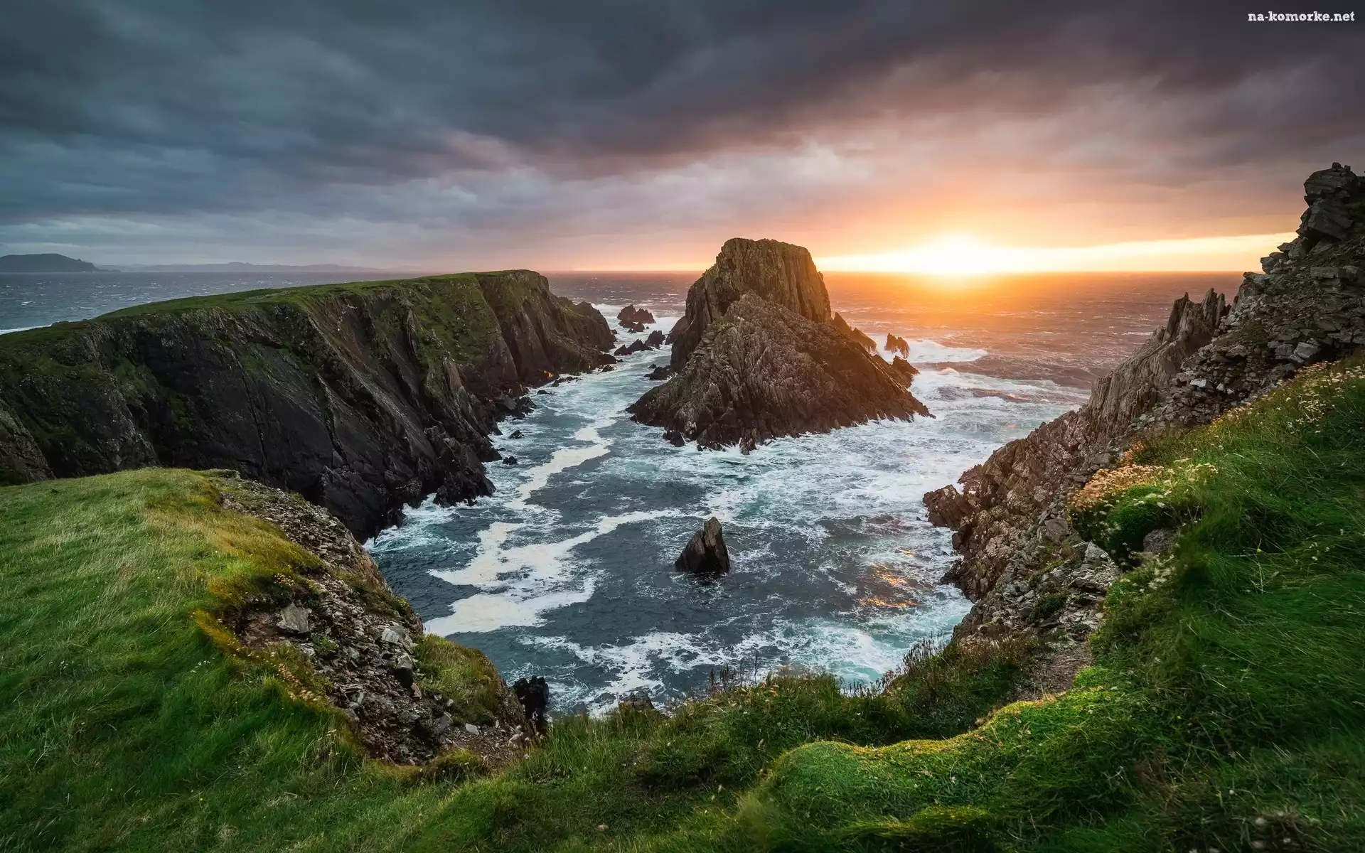 Hrabstwo Donegal, Przylądek Malin Head, Zachód słońca, Irlandia, Morze, Skały, Chmury na Komórkę |