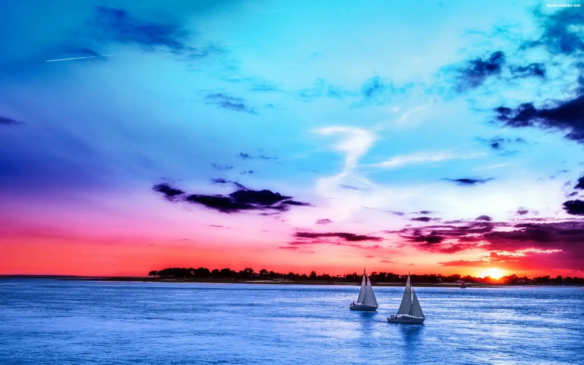 Słońca, Dwa, Jachty, Jezioro, Zachód na Komórkę