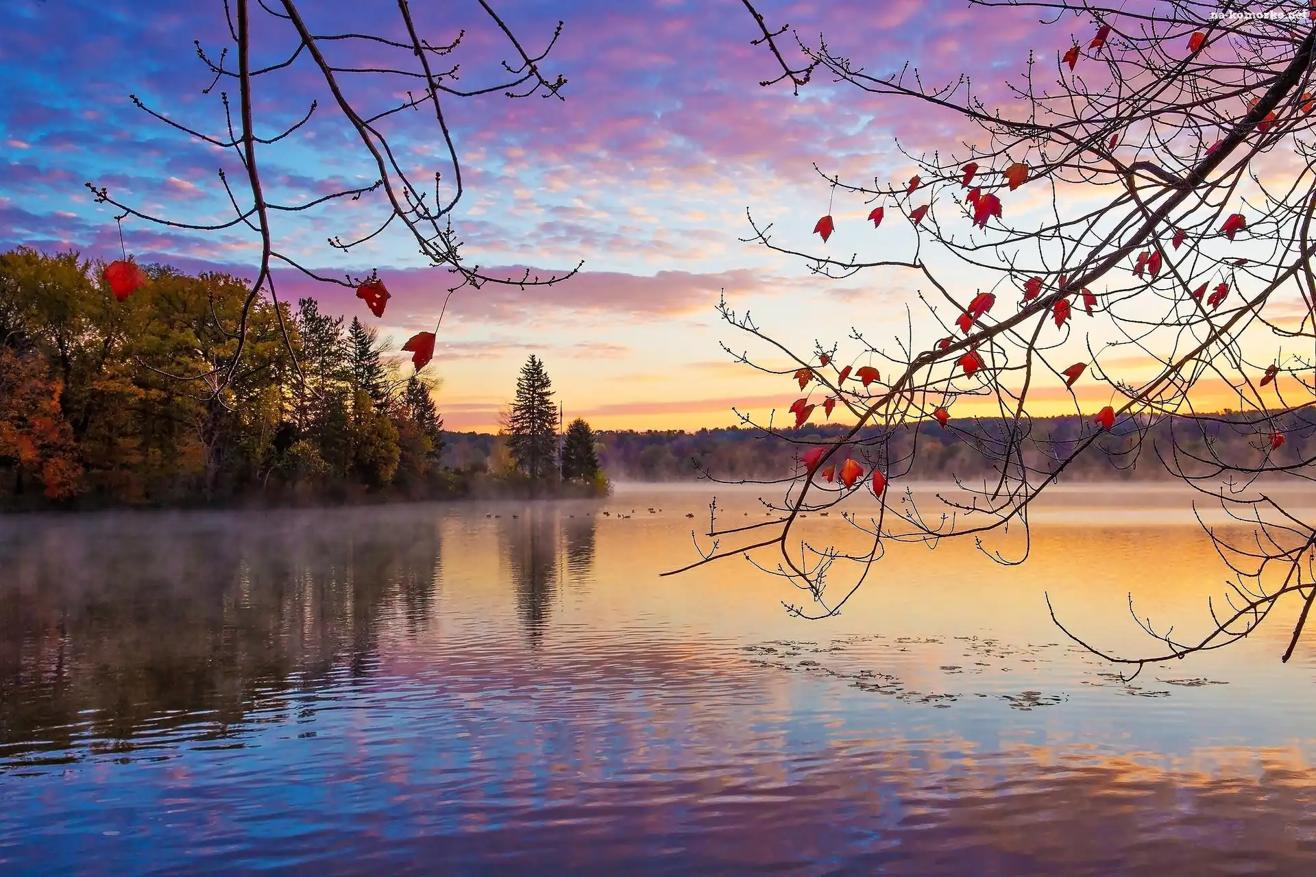 Jezioro, Słońca, Jesień, Lasy, Mgła, Kaczki, Wschód na Komórkę