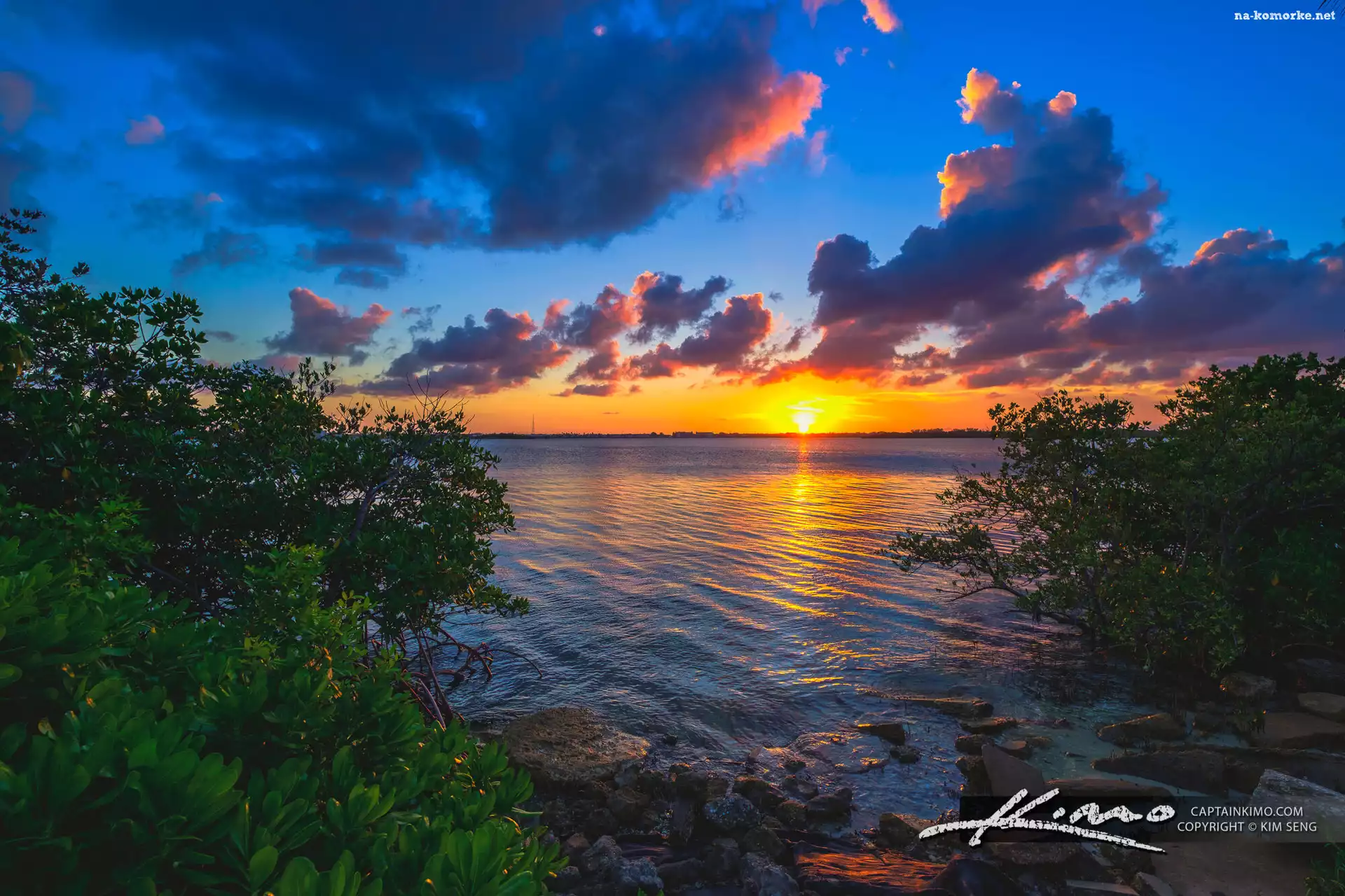 Wyspa Singera, Zachód słońca, Drzewa, Stany Zjednoczone, Kamienie, Chmury, Jezioro Worth Laguna, Floryda na Komórkę |