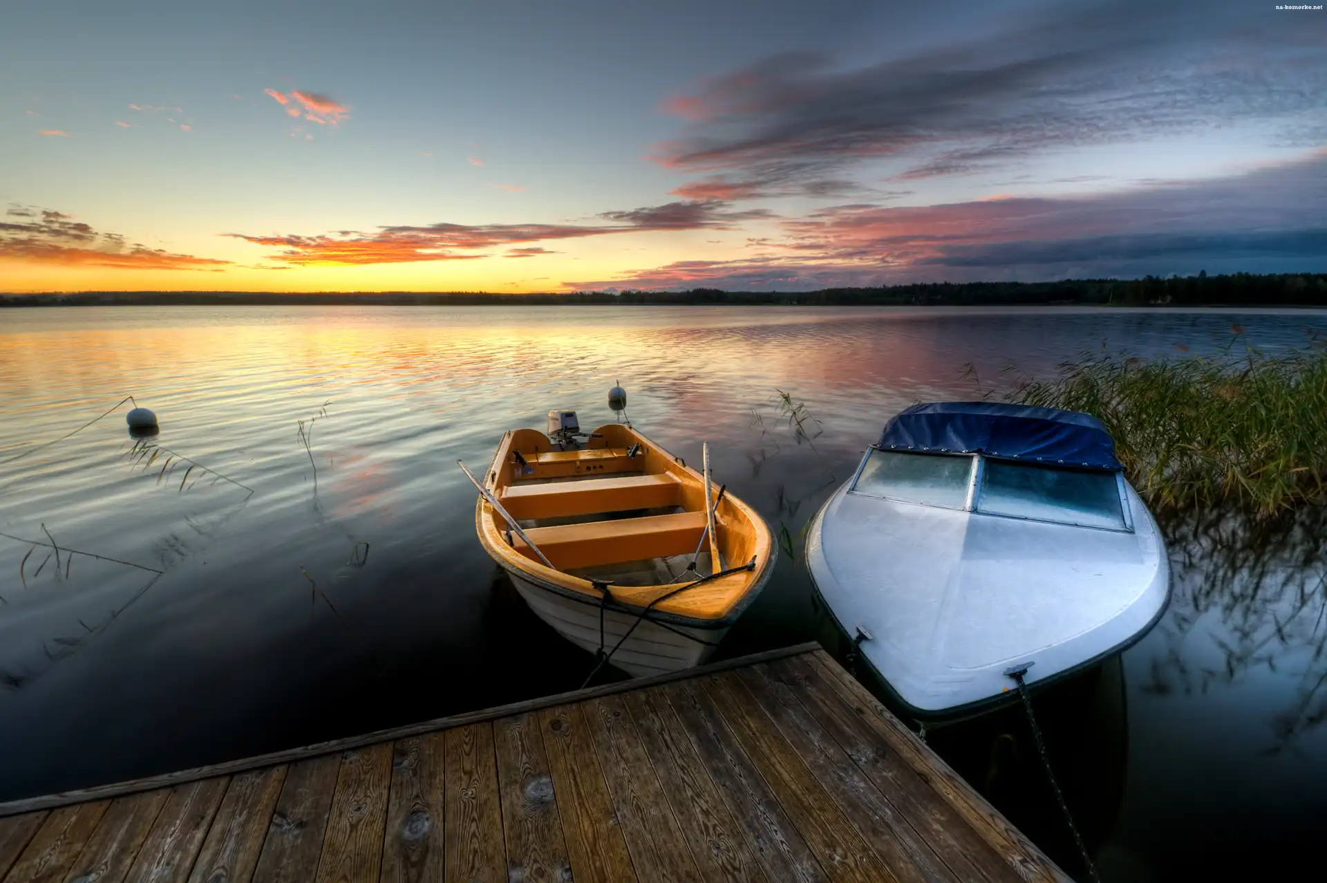 Łódki, Jezioro, Zachód, Słońca, Pomost na Komórkę