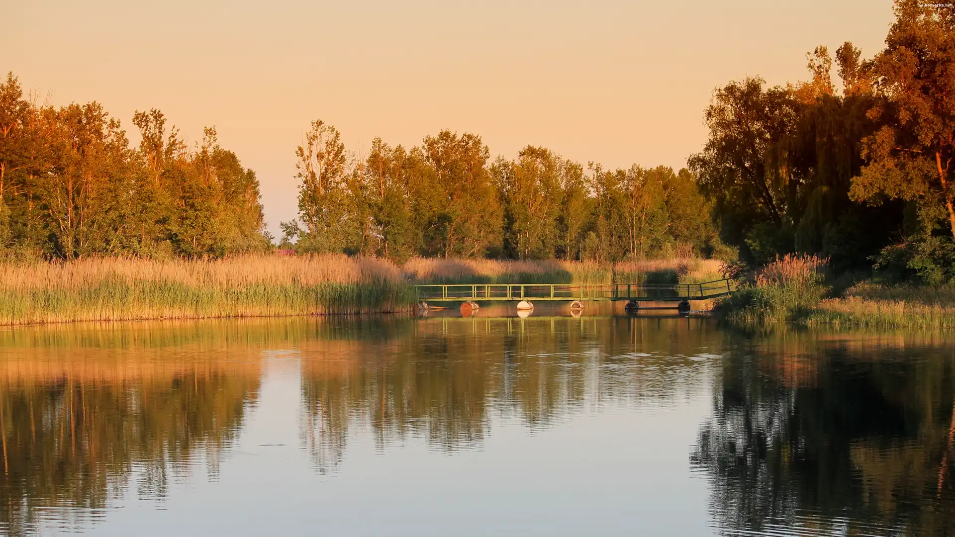 Jezioro, Słońca, Jesień, Odbicie, Trzciny, Drzewa, Zachód na Komórkę