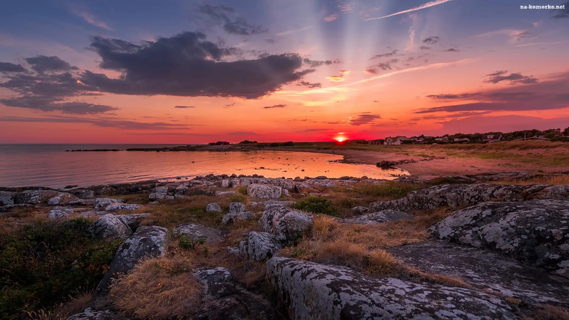 Zachód słońca, Domy, Morze, Wybrzeże, Zatoka, Skały, Kamienie na Komórkę