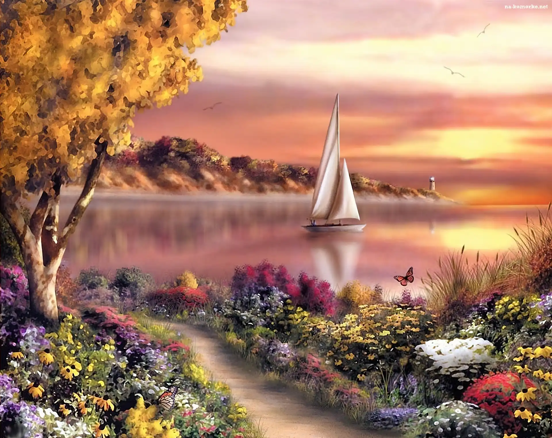 Słońca, Jezioro, Żaglówka, Kwiaty, Zachód na Komórkę