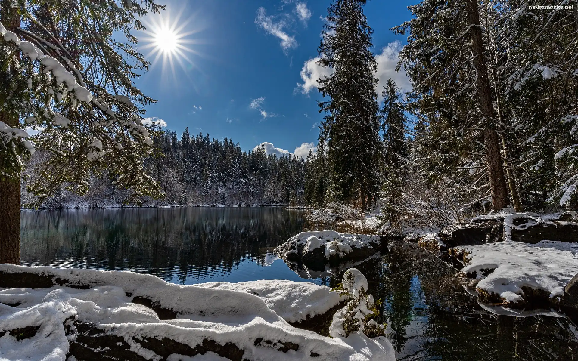 Lake Cresta, Zima, Drzewa, Promienie słońca, Szwajcaria, Jezioro, Kanton Gryzonia, Las, Śnieg na Komórkę |