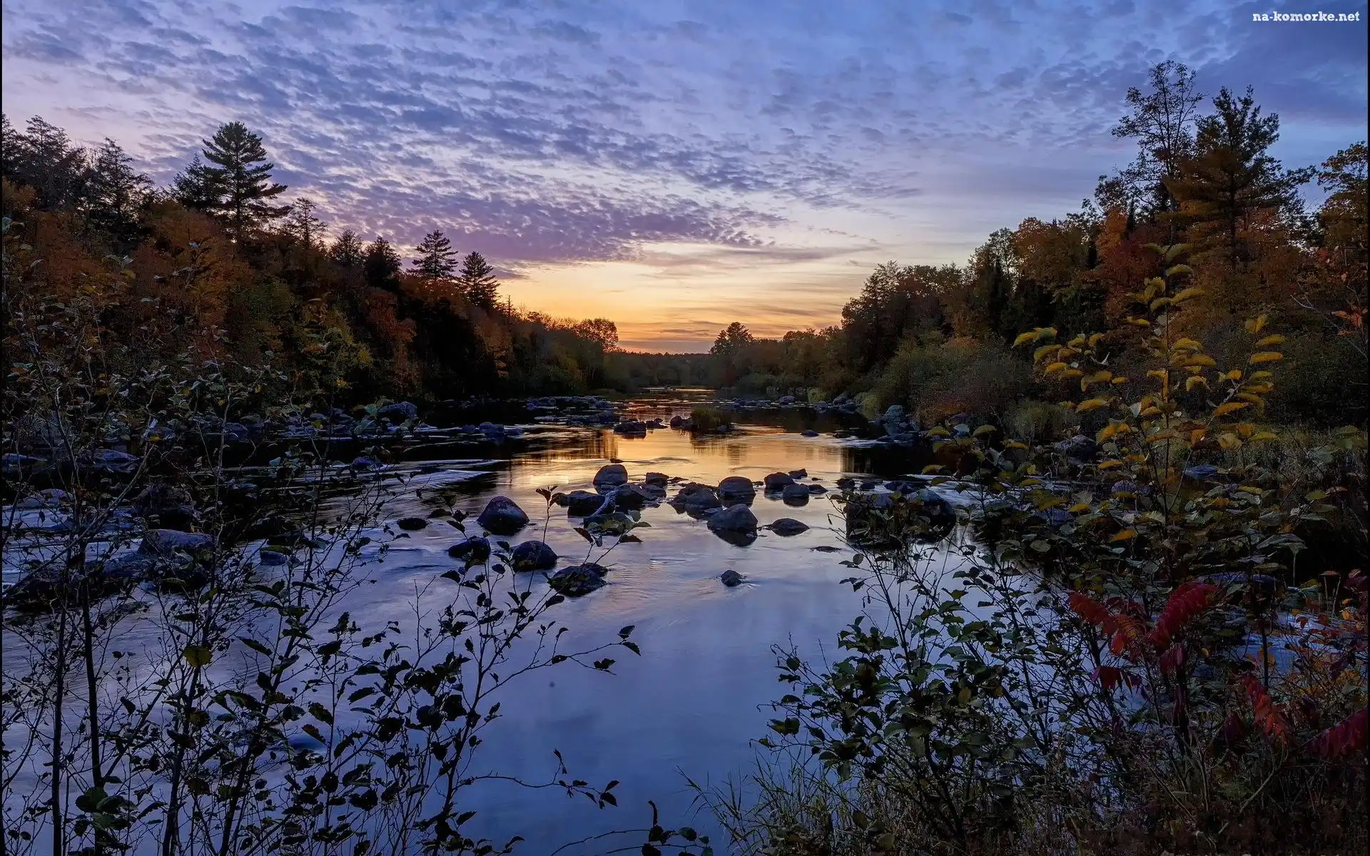Słońca, Rzeka, Kamienie, Las, Zachód na Komórkę