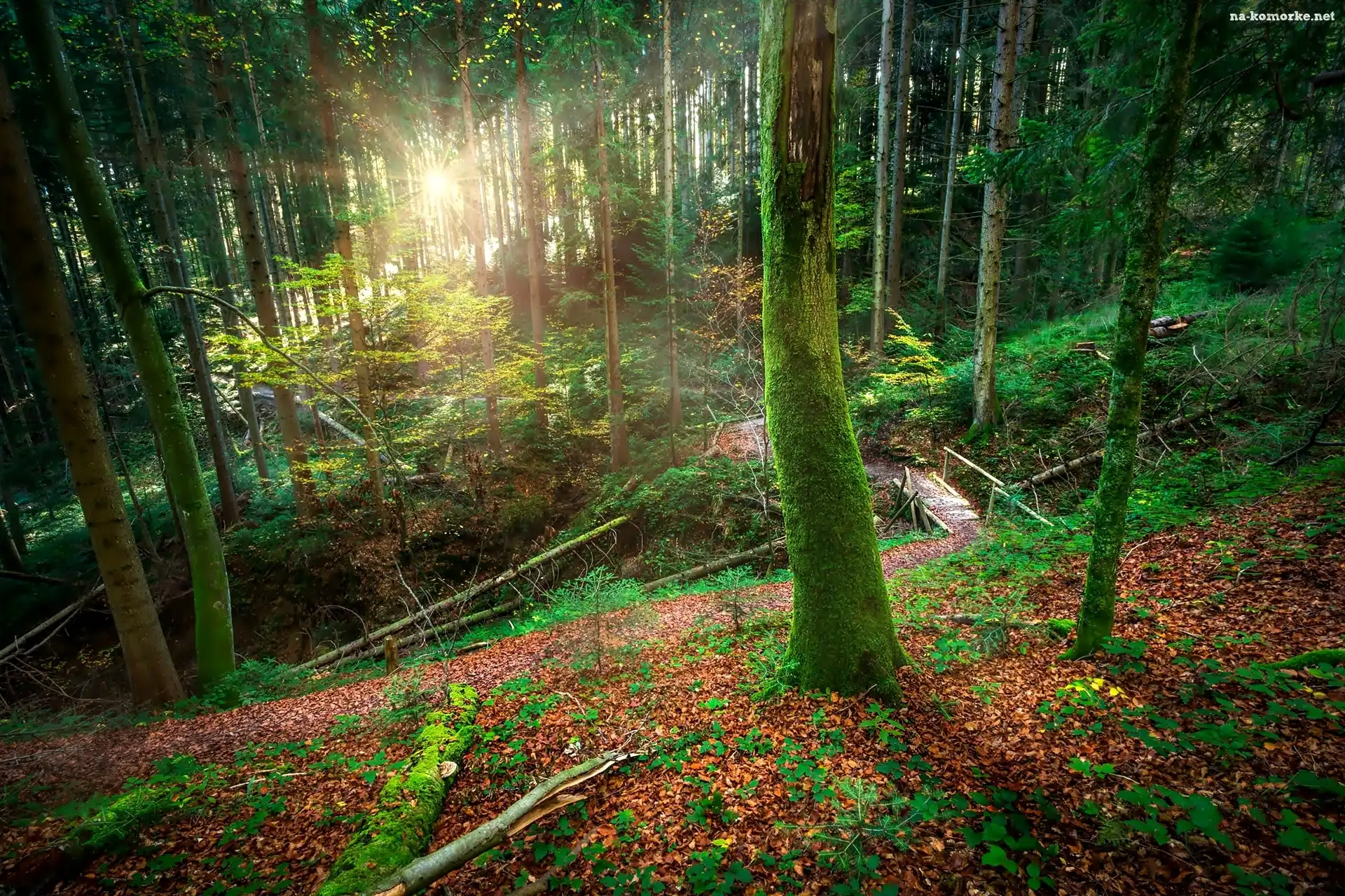 Ścieżka, Las, Promienie, Słońca, Kładka na Komórkę