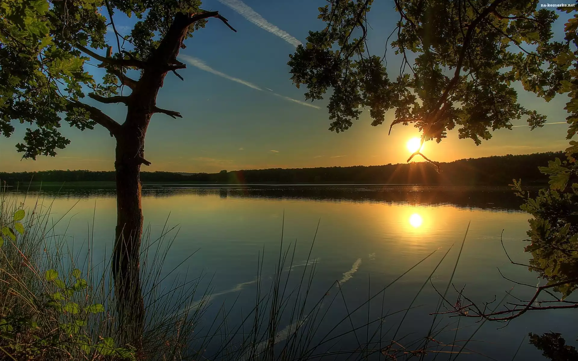 Słońca, Jezioro, Drzewa, Lasy, Wschód na Komórkę