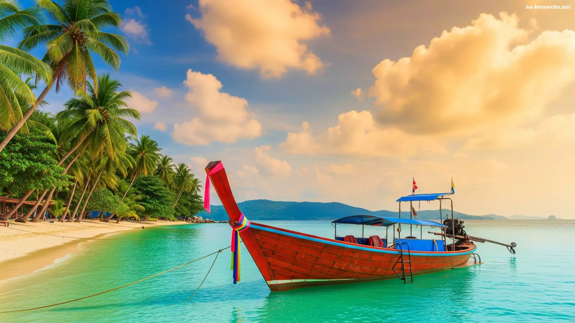 Morze, Palmy, Zachód słońca, Plaża, Łódka na Komórkę