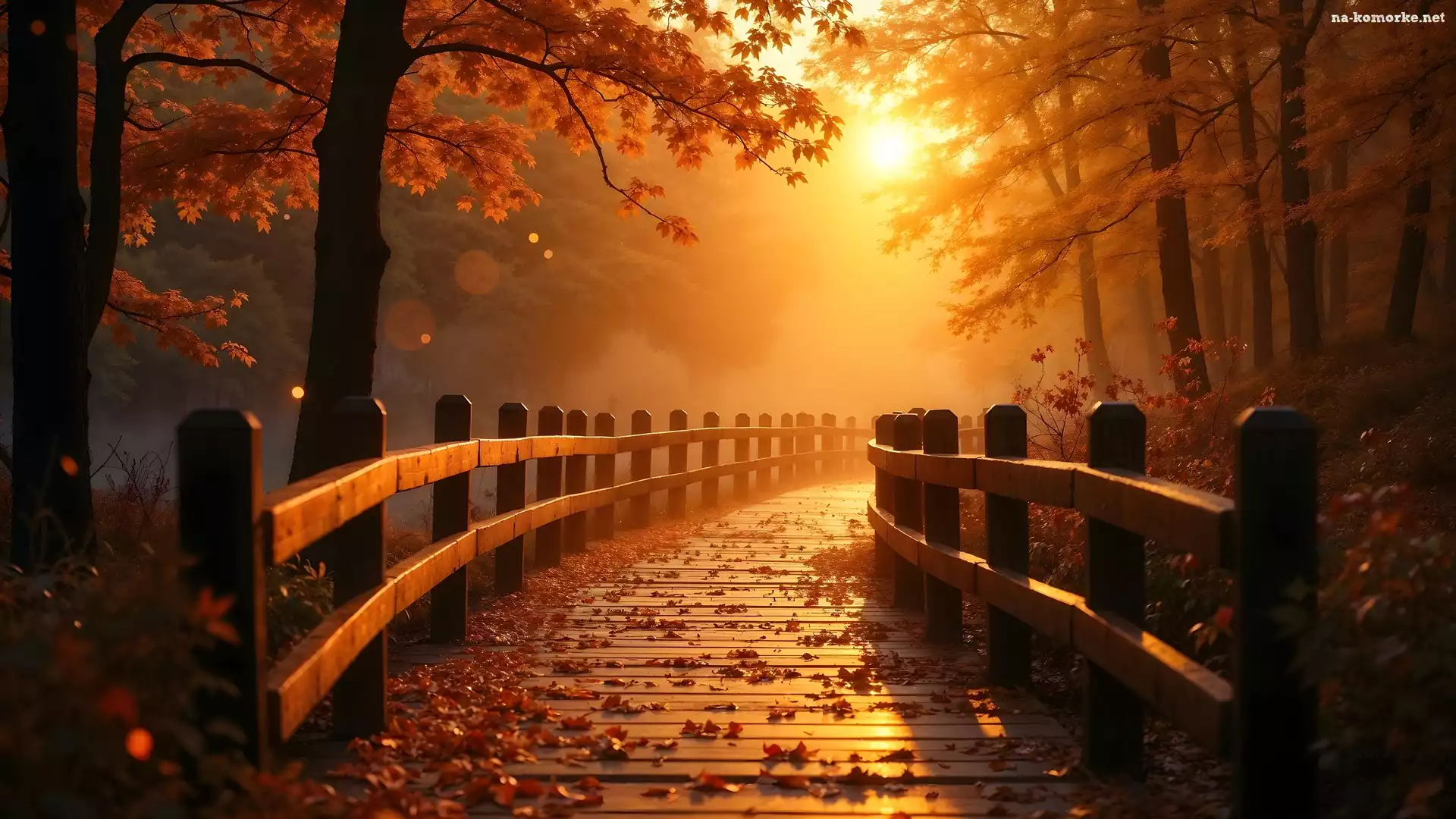 Jesień, Most, Zachód słońca, Drzewa, Mgła na Komórkę
