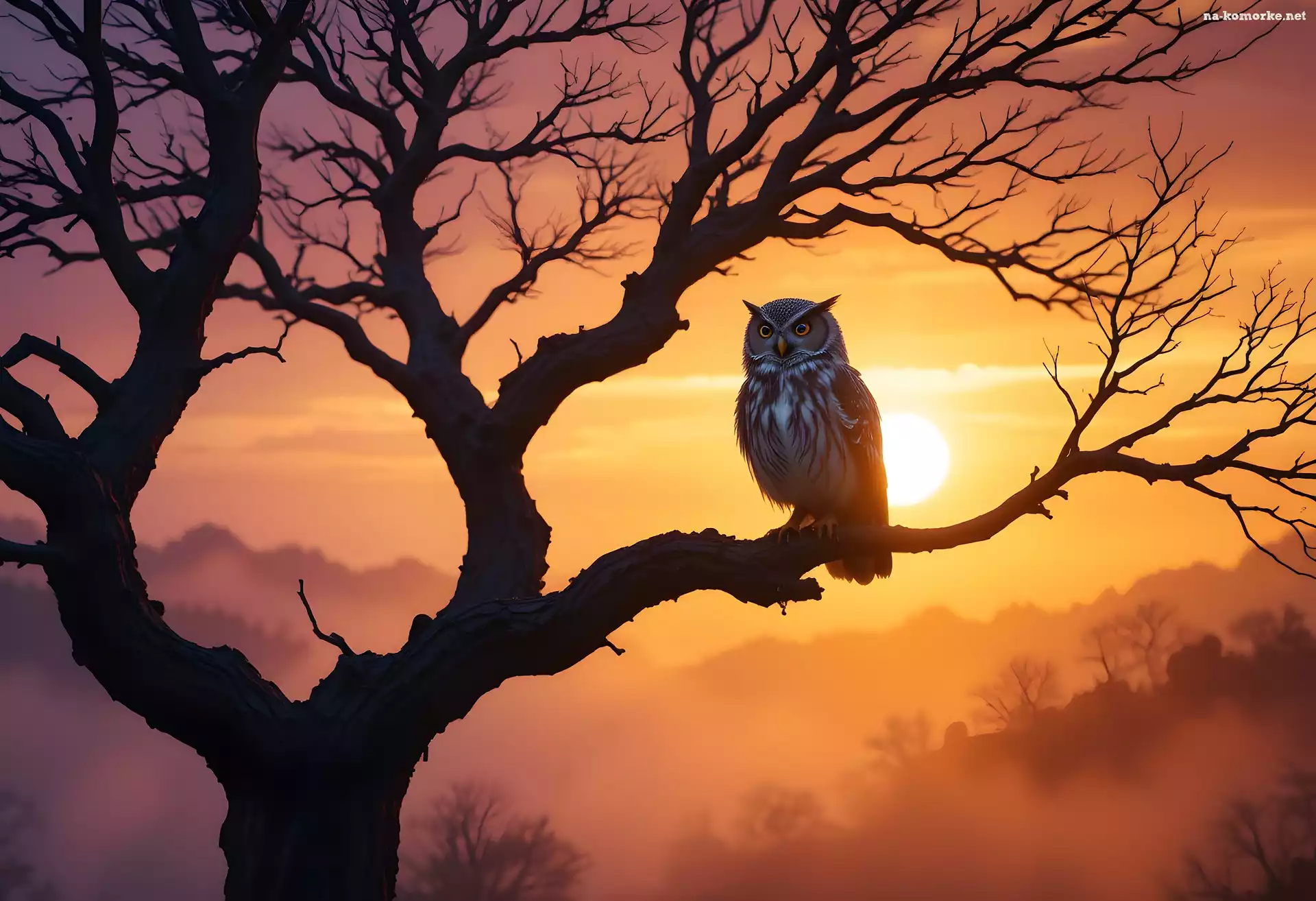 Sowa, Drzewo, Zachód słońca, Puchacz, Mgła na Komórkę