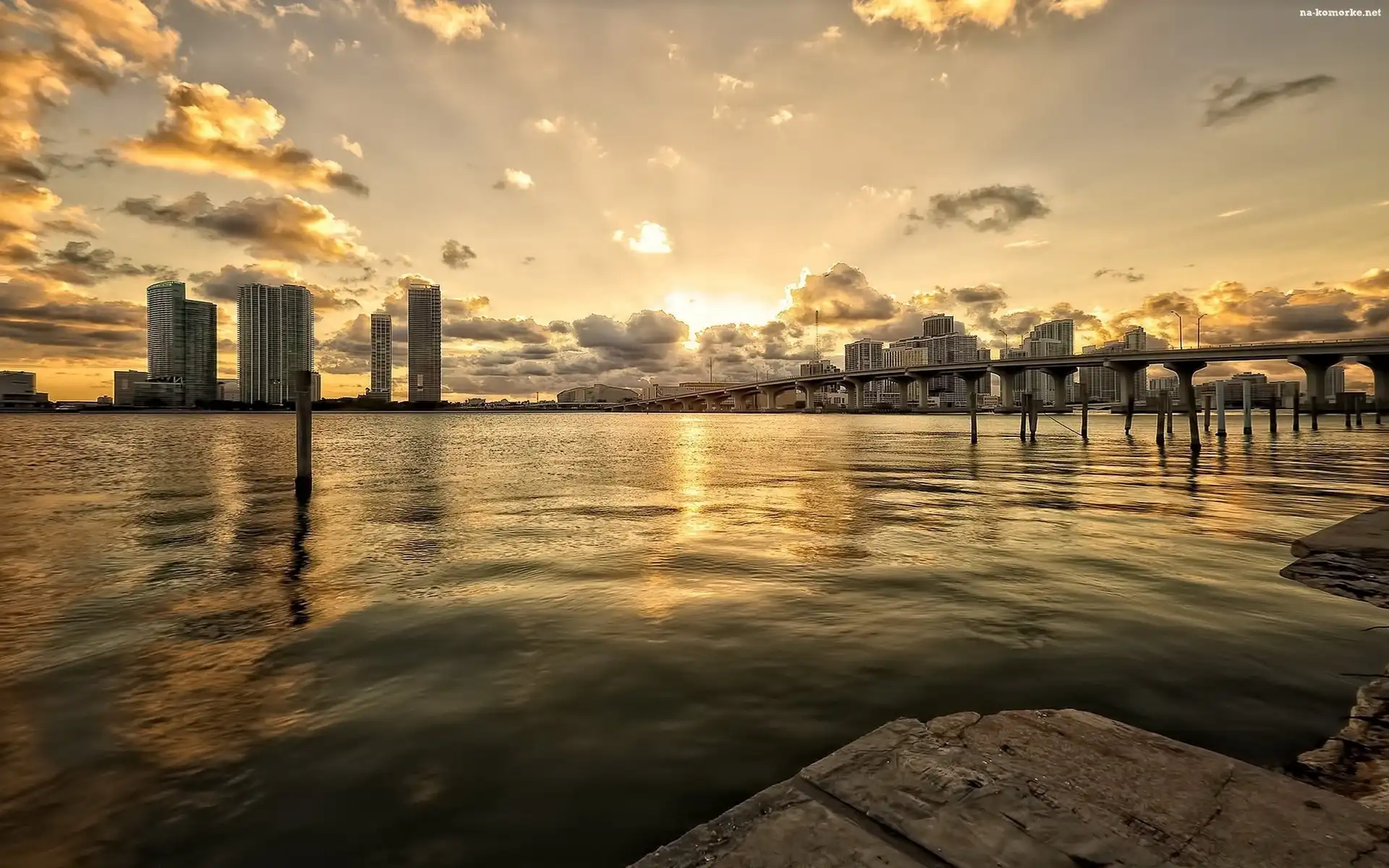 Słońca, Most, Woda, Miasto, Wschód na Komórkę
