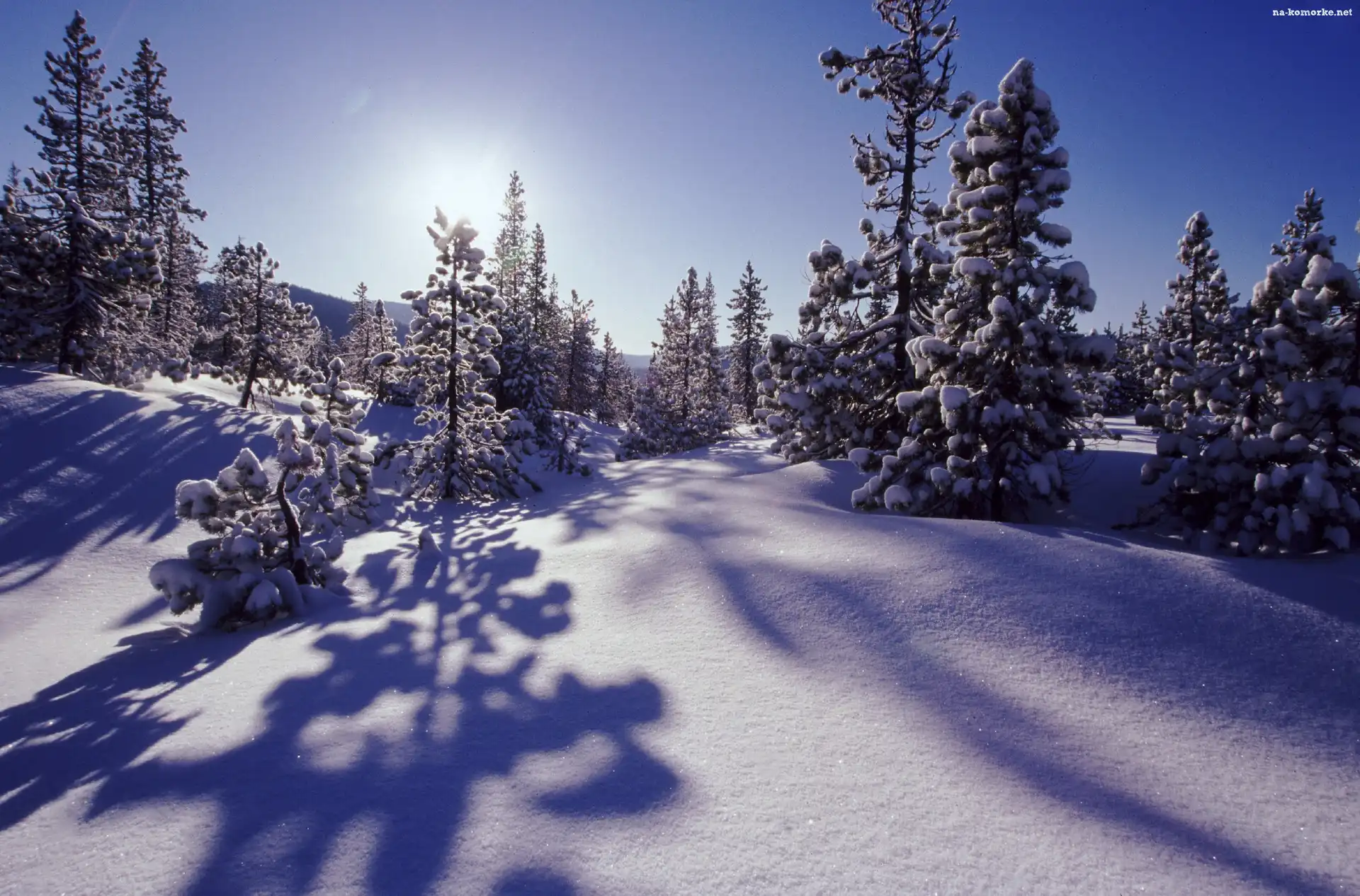 Słońca, Drzewka, Pokryte, Śniegiem, Promienie na Komórkę