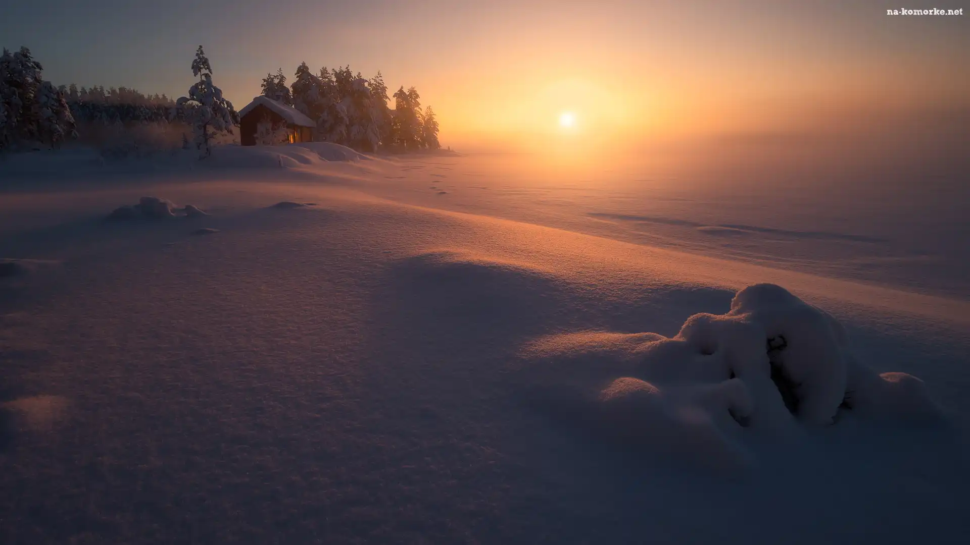 Drzewa, Zaśnieżone, Zima, Domek, Norwegia, Jezioro, Ringerike, Mgła, Wschód słońca na Komórkę