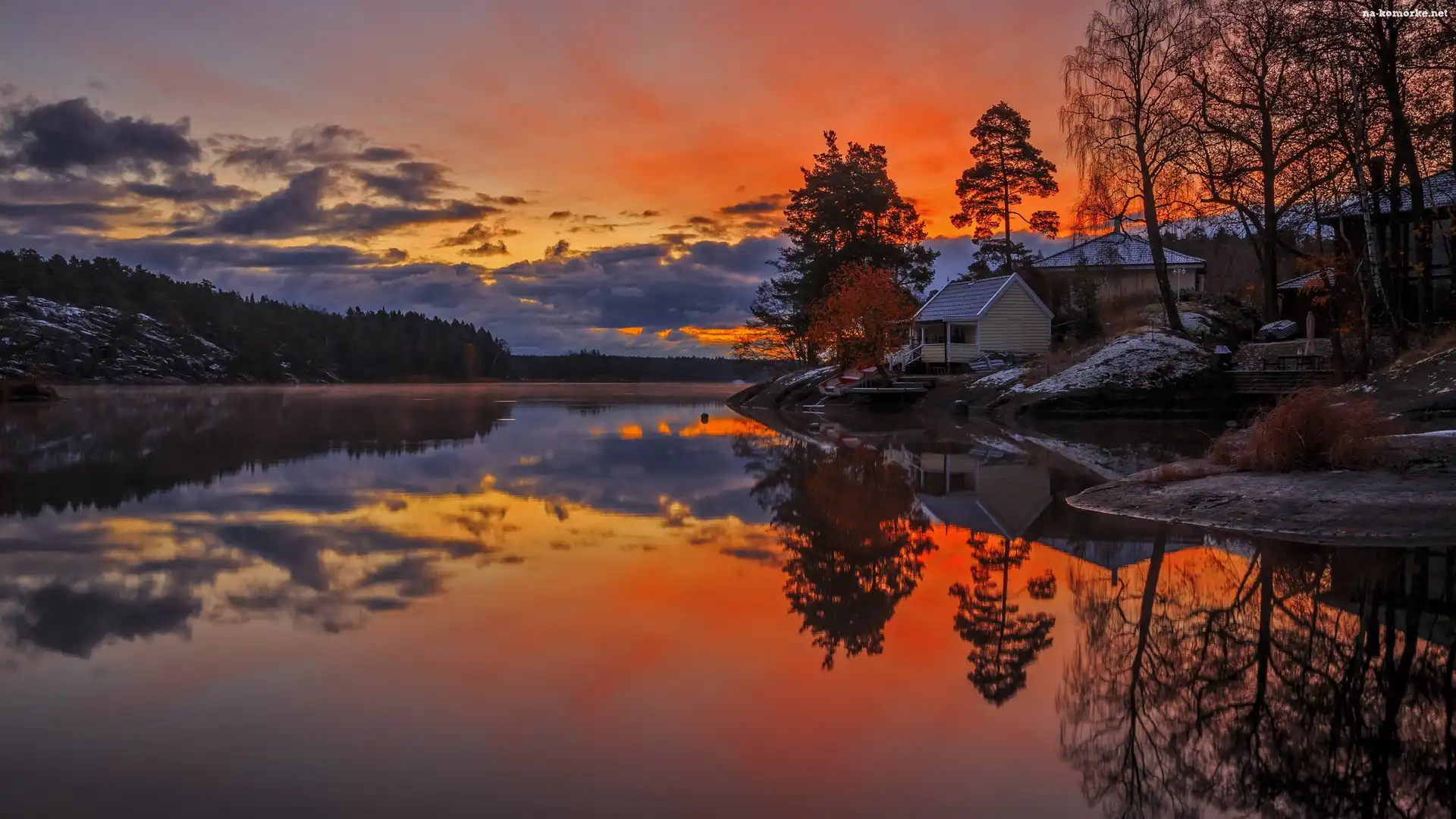 Zachód słońca, Drzewa, Odbicie, Jezioro, Chmury, Dom, Łódka na Komórkę