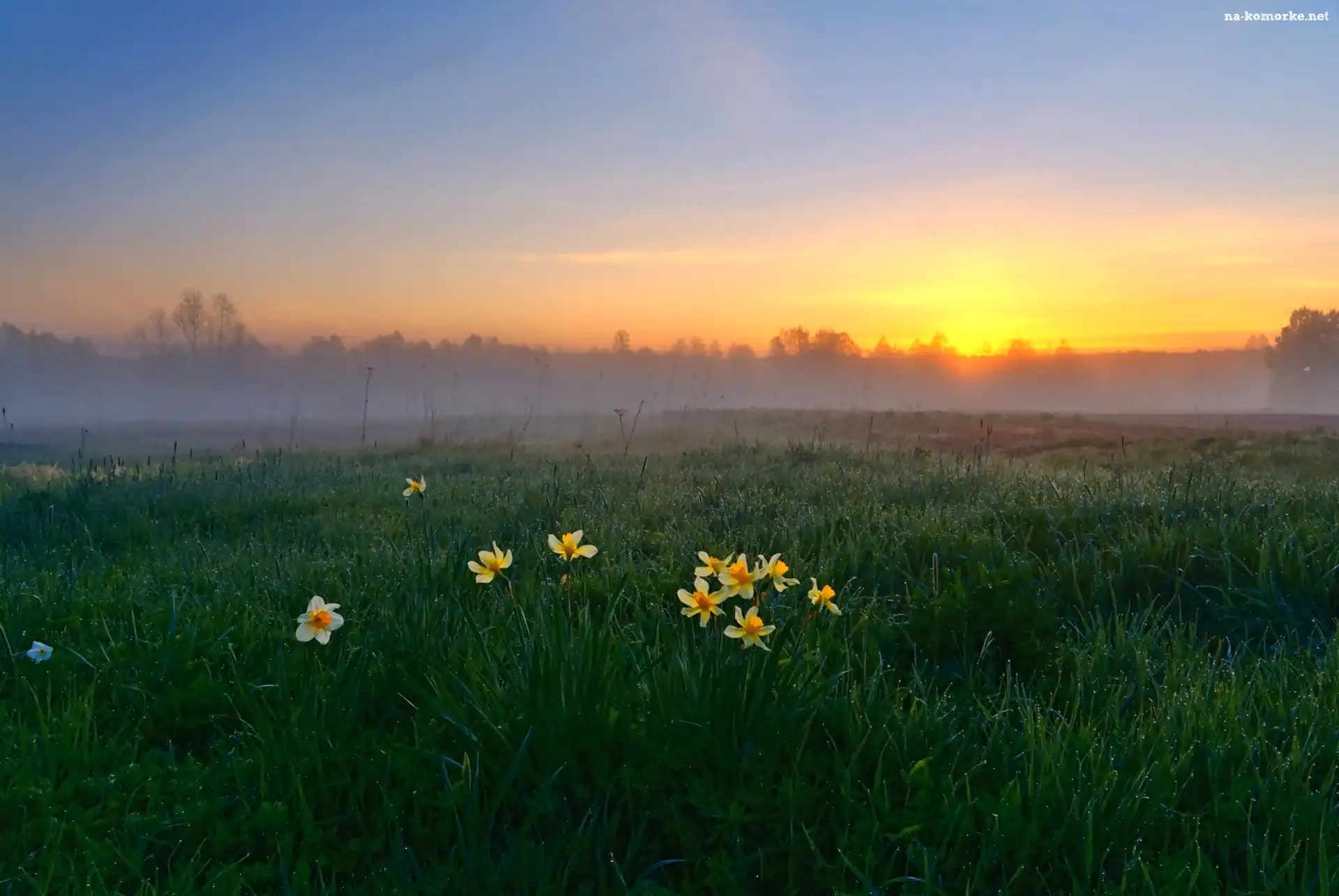 Łąka, Żonkile, Wschód słońca, Mgła na Komórkę