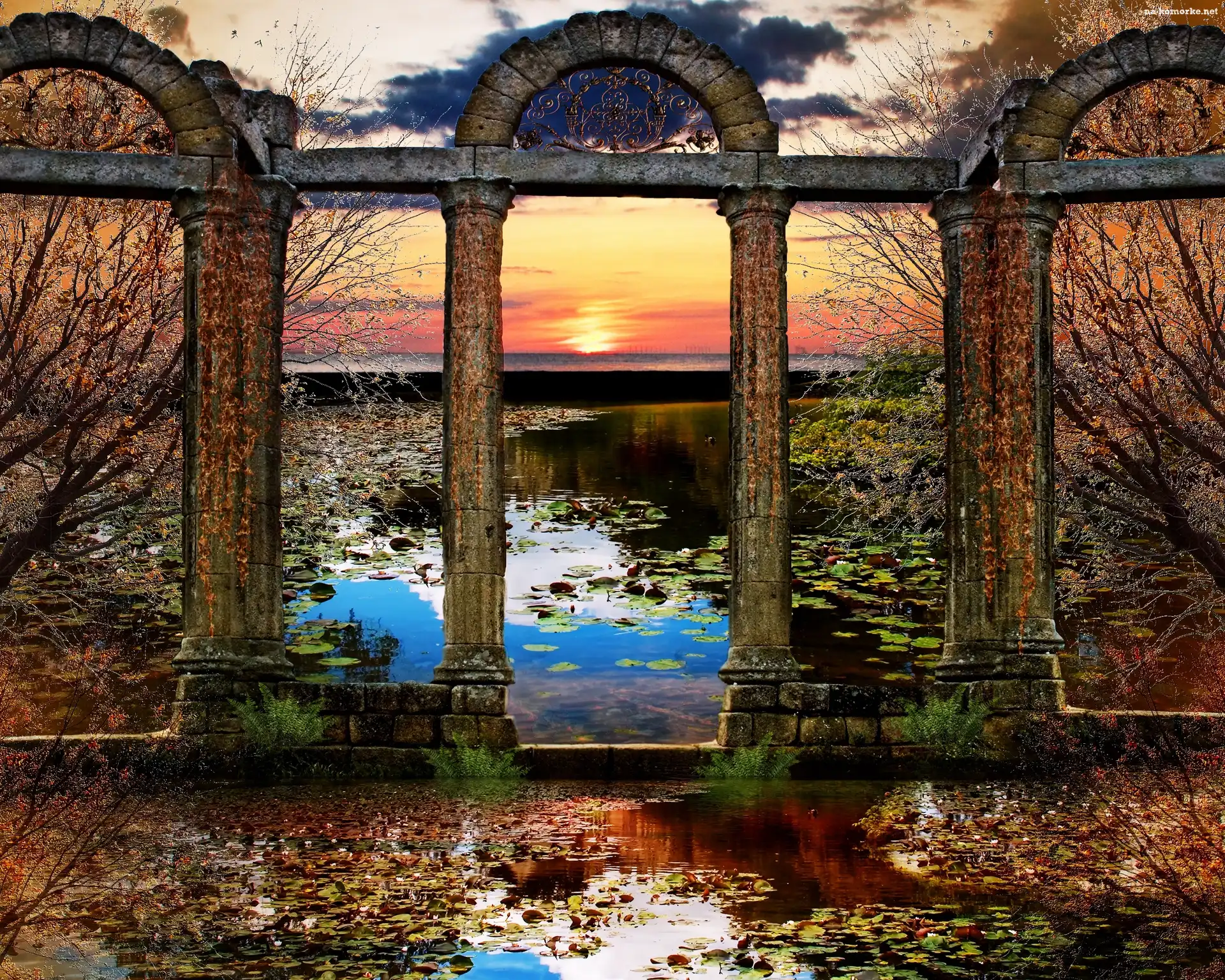Park, Słońca, Rośliny, Staw, Arkada, Jezioro, Zachód na Komórkę
