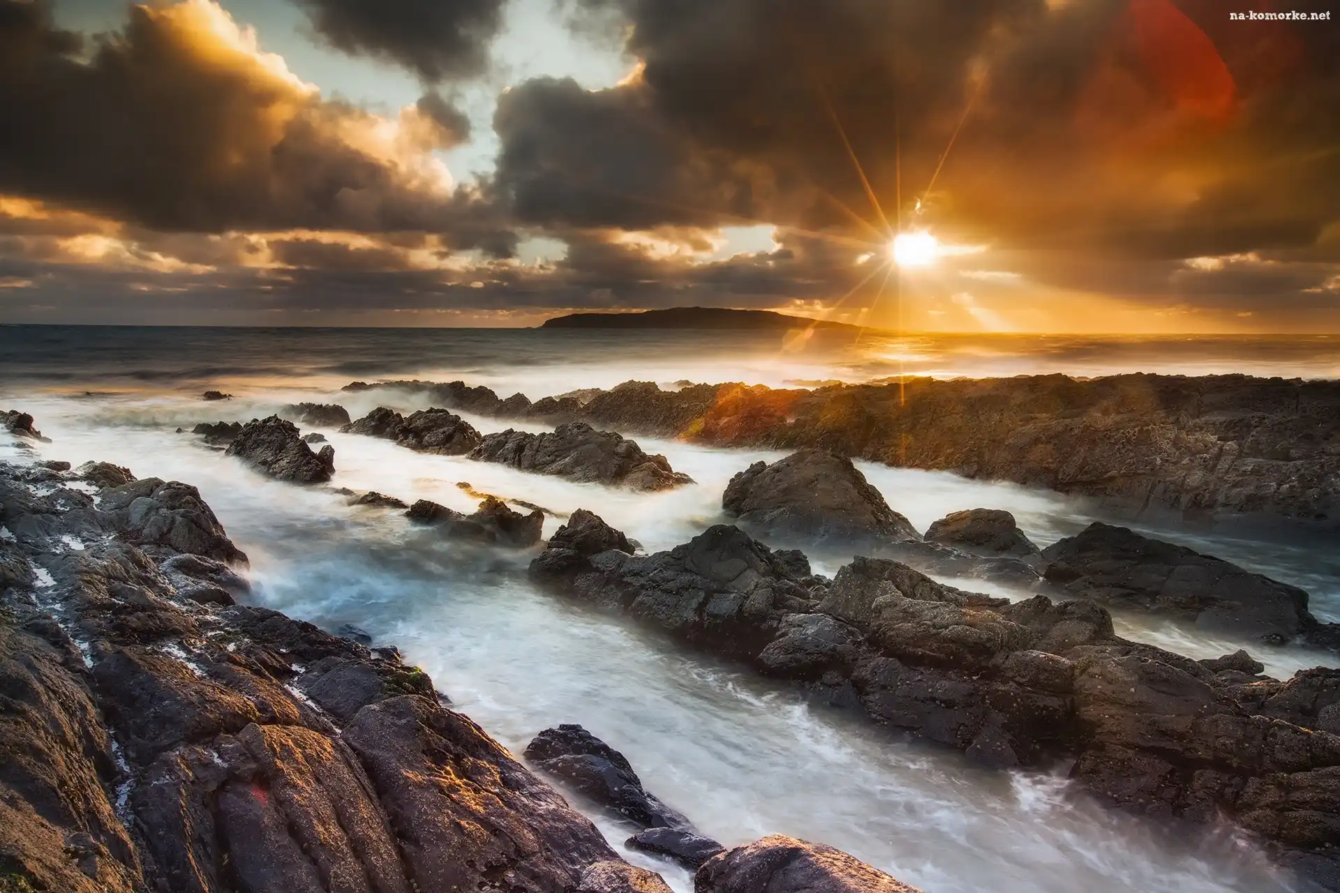 Promienie słońca, Morze, Skały, Zachód słońca, Chmury na Komórkę