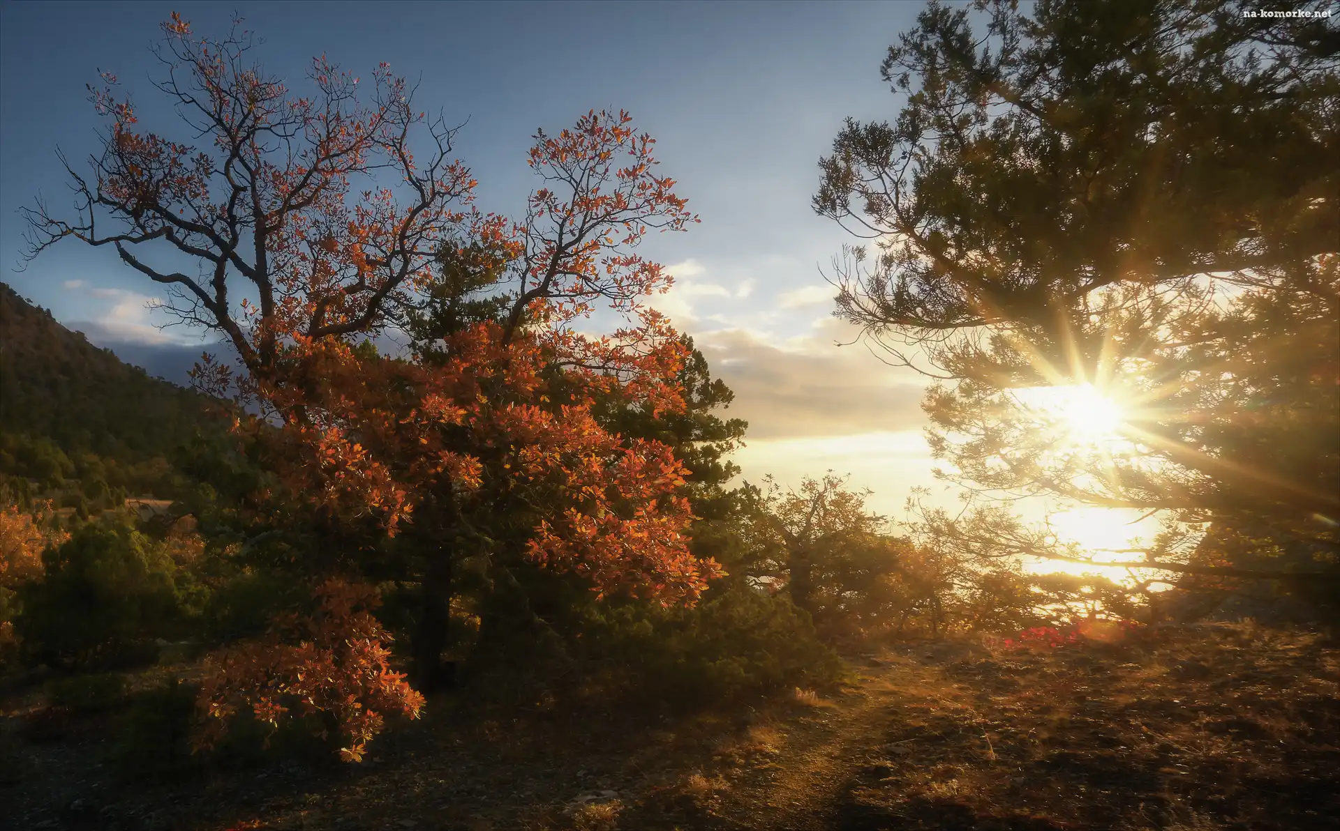 Promienie słońca, Krym, Nowy Świat, Drzewa, Jesień na Komórkę