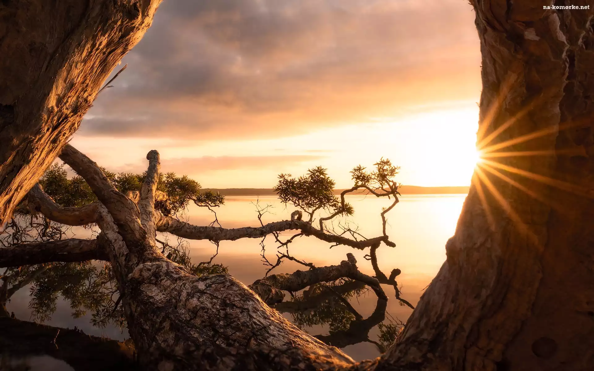 Australia, Drzewo, Jezioro, Konary, Queensland, Weyba Lake, Skała, Promienie słońca na Komórkę
