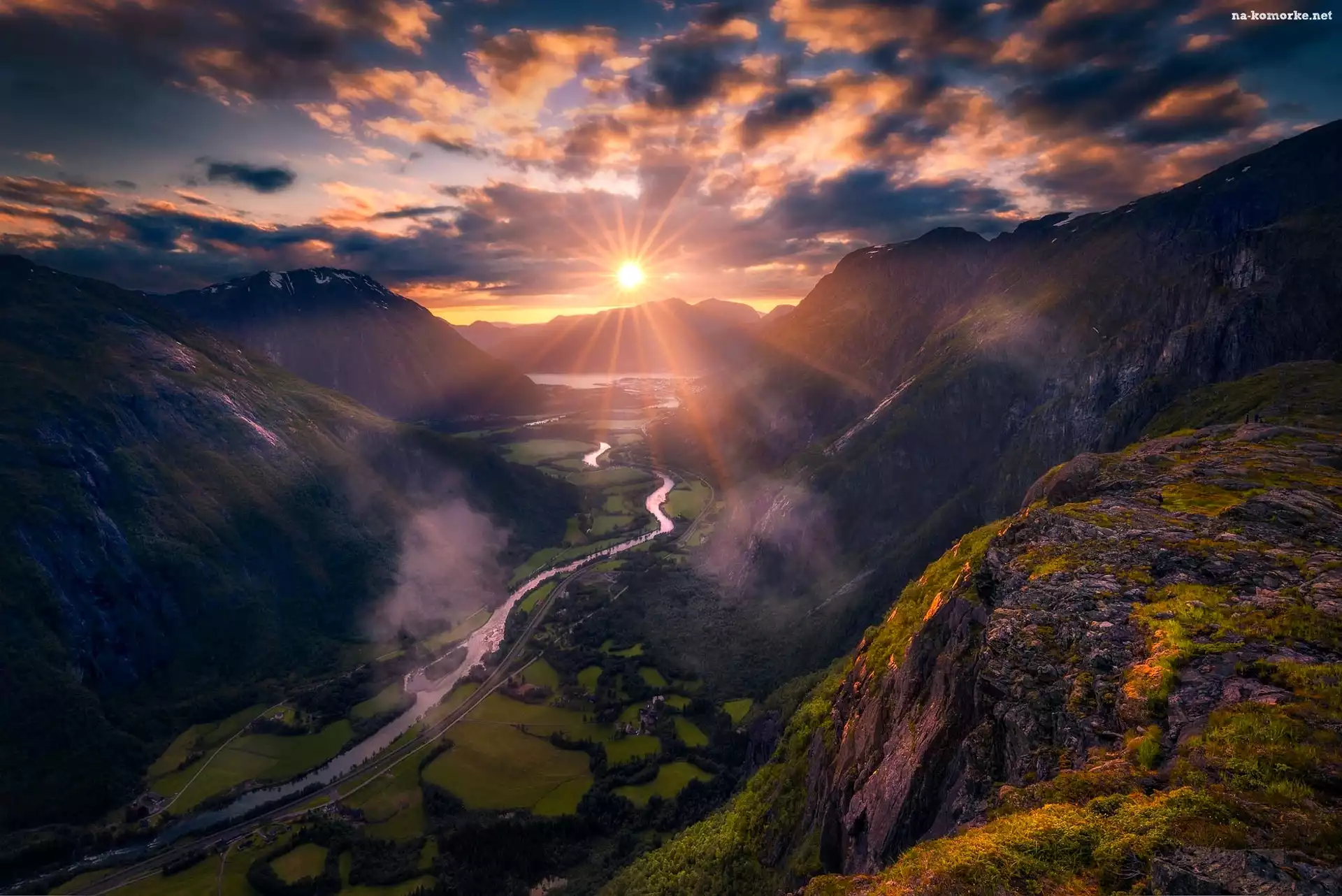 Norwegia, Góry, Rzeka Rauma, Dolina Romsdalen, Wschód słońca na Komórkę
