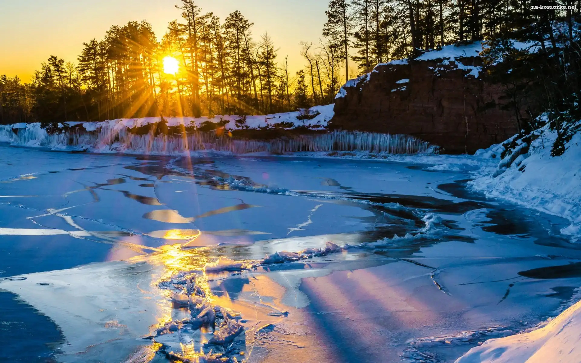 Rzeka, Słońca, Zima, Lód, Skały, Las, Promienie na Komórkę