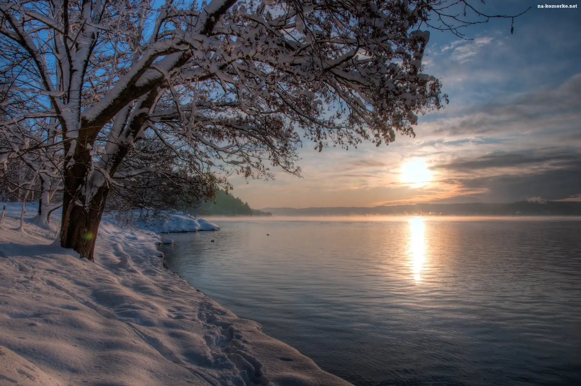 Śnieg, Rzeka, Zachód, Słońca, Drzewa na Komórkę