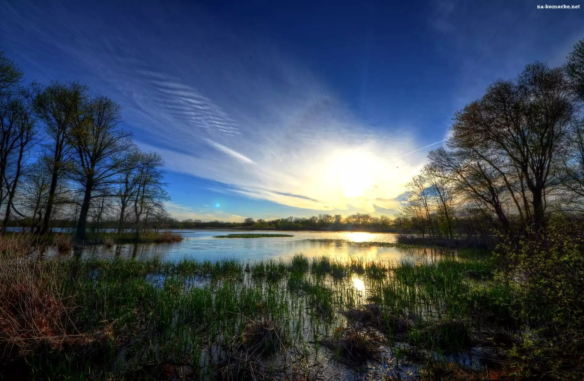 Słońca, Jezioro, Drzewa, Trawy, Wschód na Komórkę