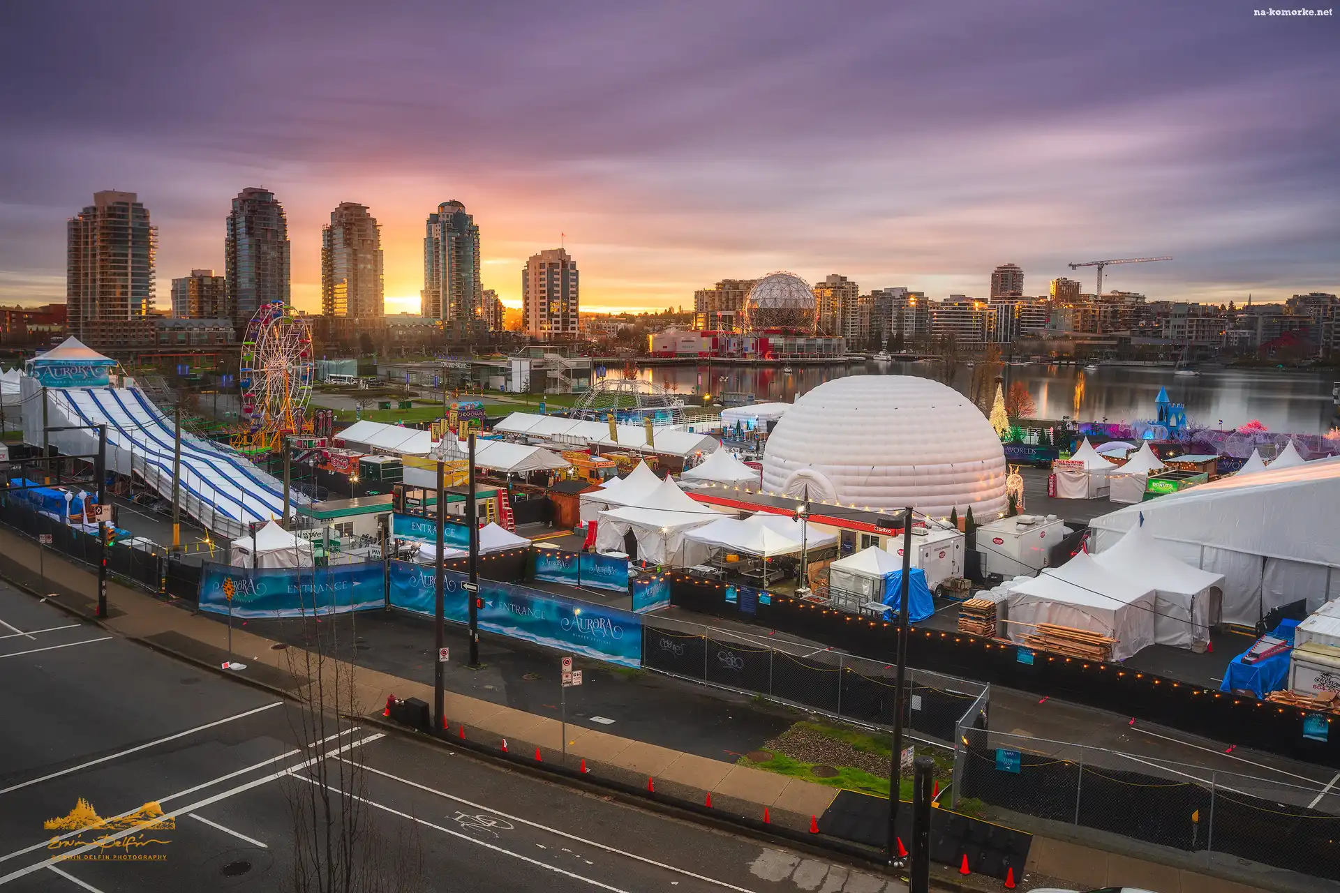 Wieżowce, Kanada, Namioty, Jarmark, Wschód słońca, Vancouver, Droga, Aurora Winter Festival, Karuzela na Komórkę |