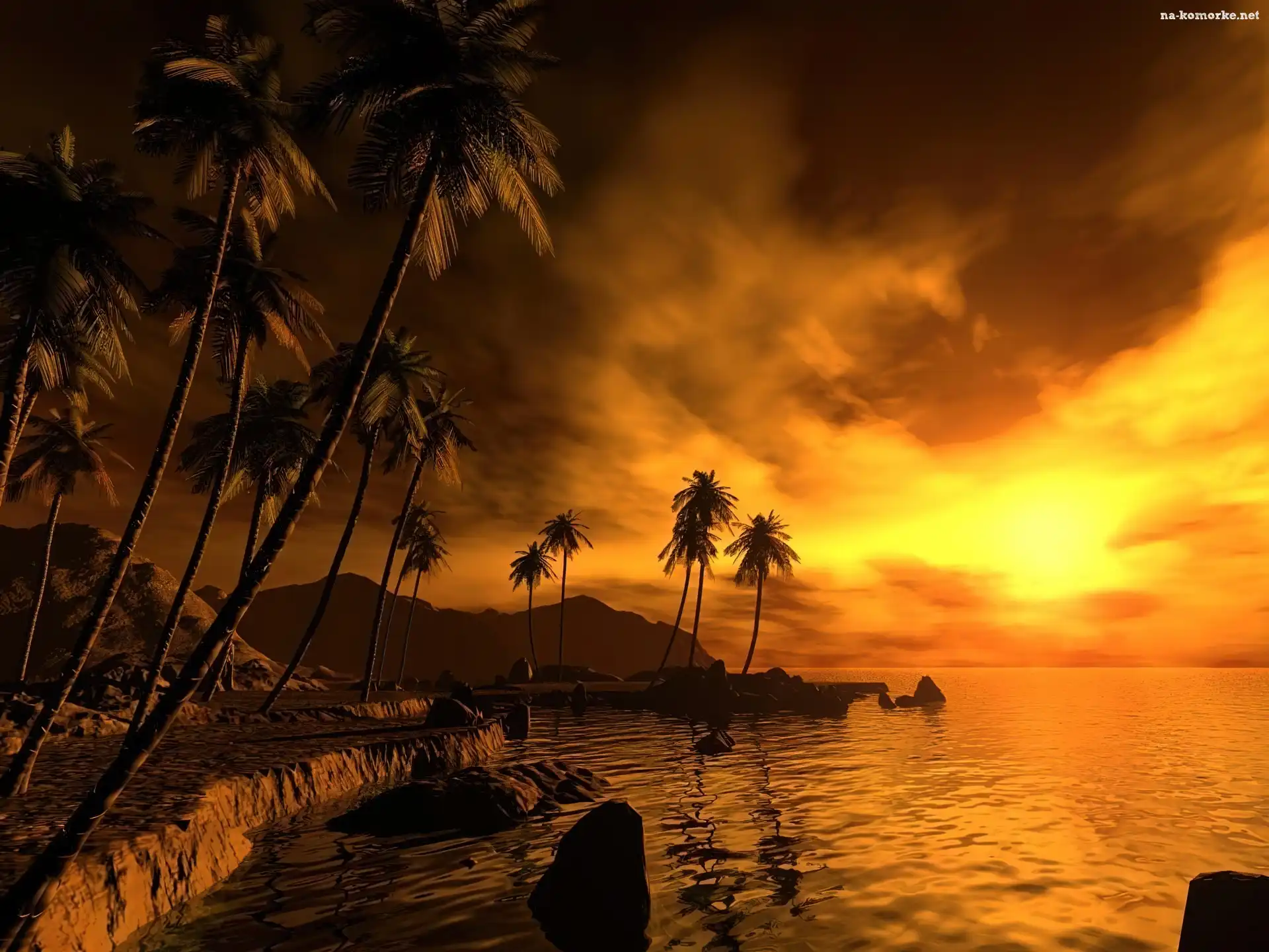 Słońca, Palmy, Wzniesienia, Woda, Zachód na Komórkę