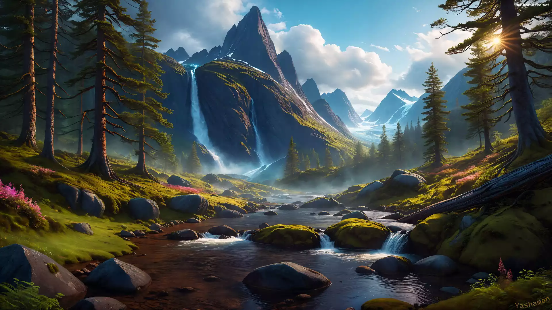 Potok, Skały, Wodospad, Drzewa, Niebo, Las, Góry, Kwiaty, Promienie słońca, Grafika, Kamienie na Komórkę |