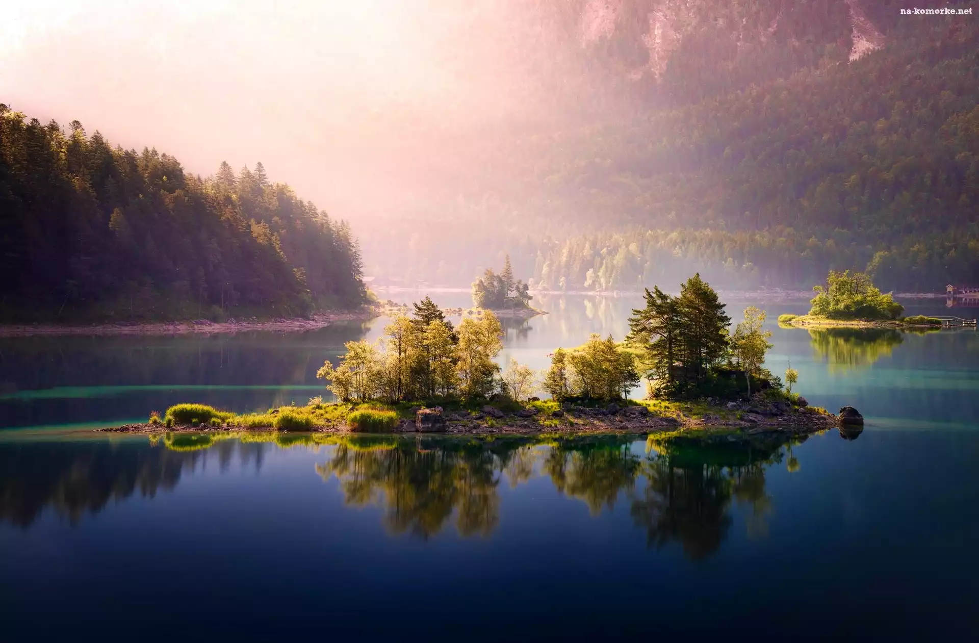 Wschód Słońca, Wysepki, Jezioro, Poranek, Lasy, Mgła na Komórkę