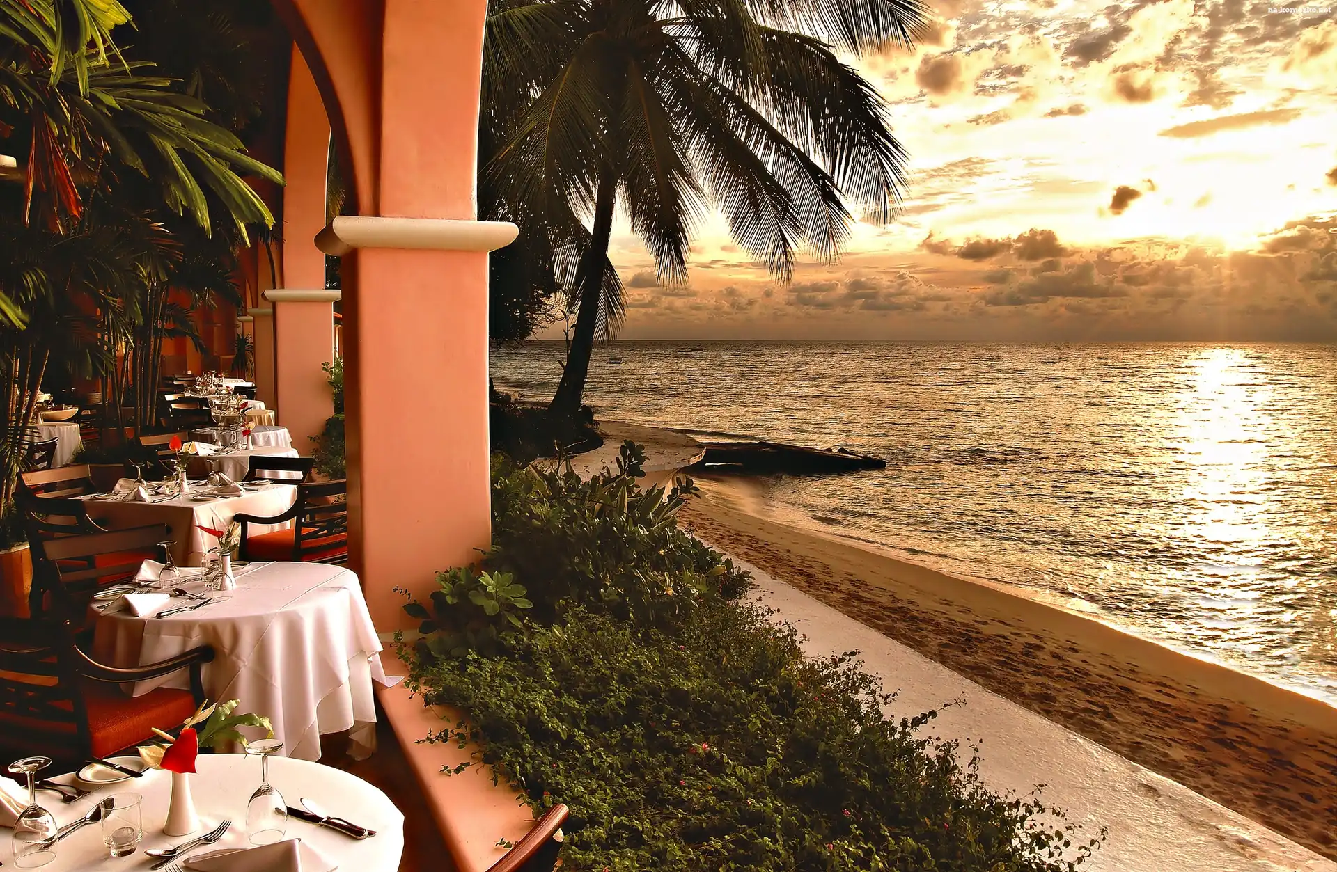 Wschód Słońca, Hotelowa Restauracja, Morze, Plaża, Poranek na Komórkę