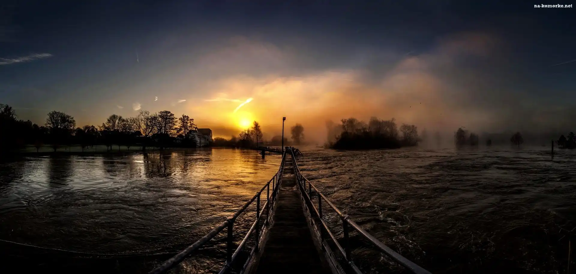 Słońca, Most, Rzeka, Drzewa, Wschód, Mgła na Komórkę