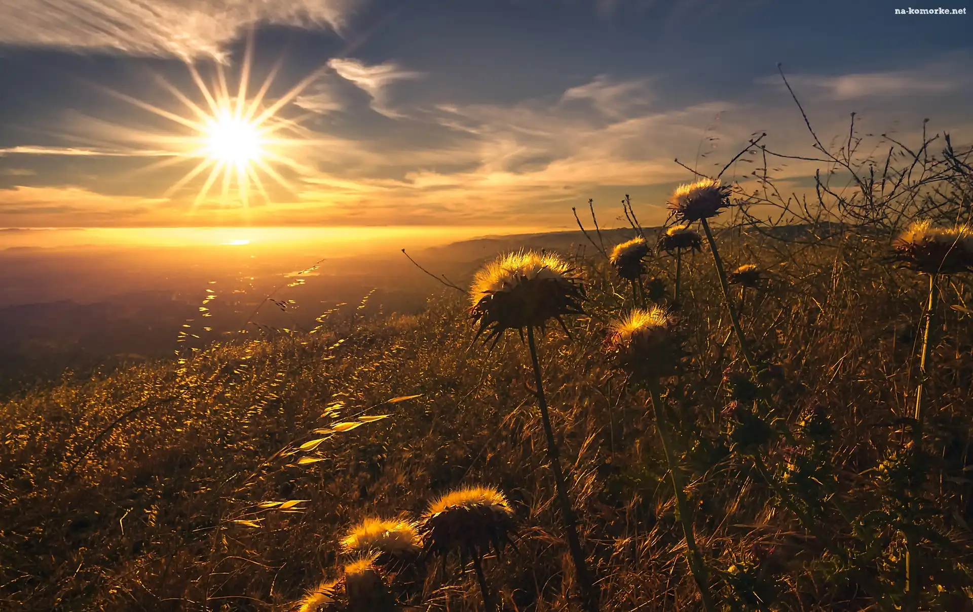 Wschód słońca, Łąka, Rośliny, Promienie słońca, Świt na Komórkę