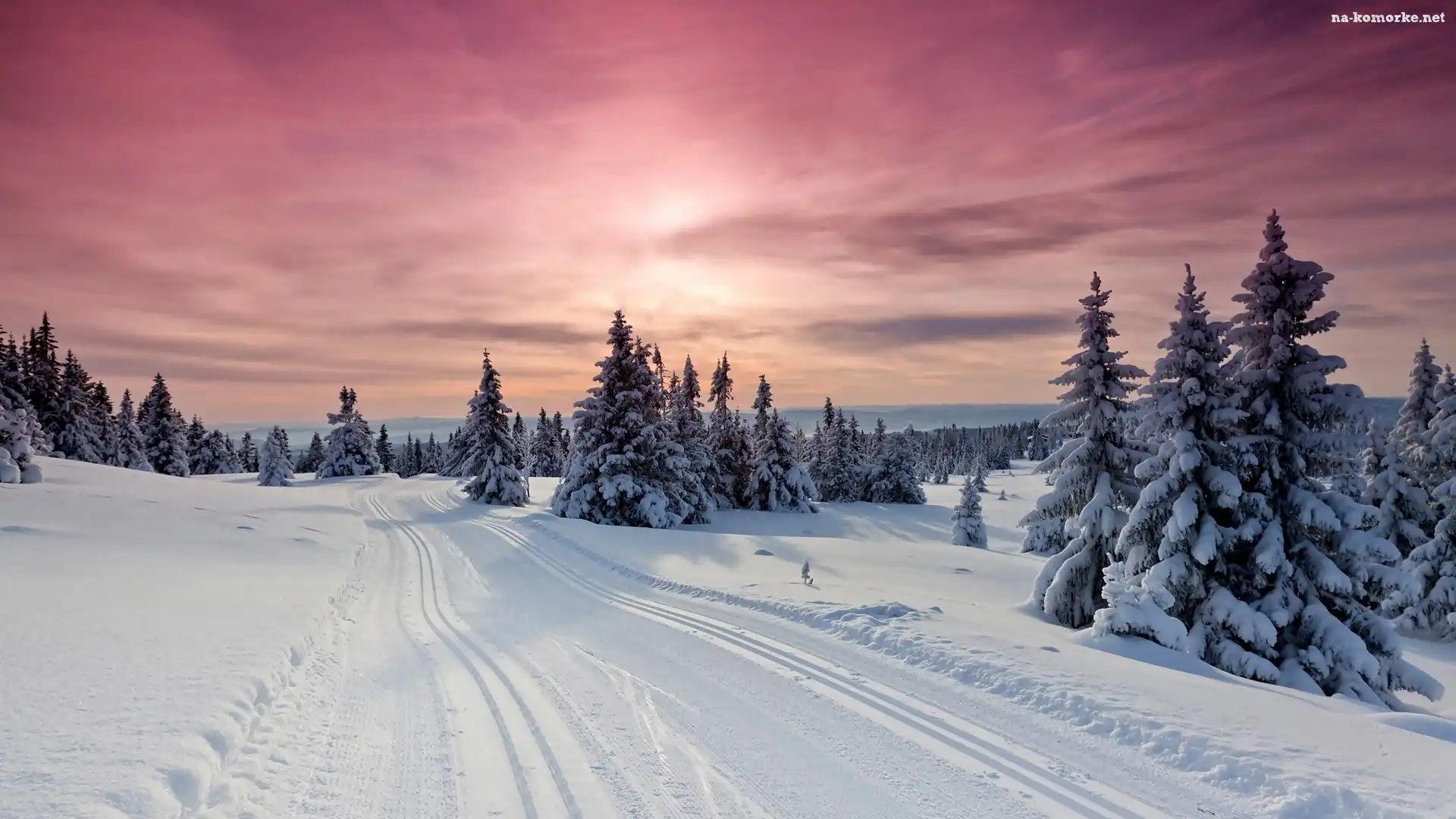 Zachód słońca, Lasy, Góry, Zima, Drzewa, Droga na Komórkę