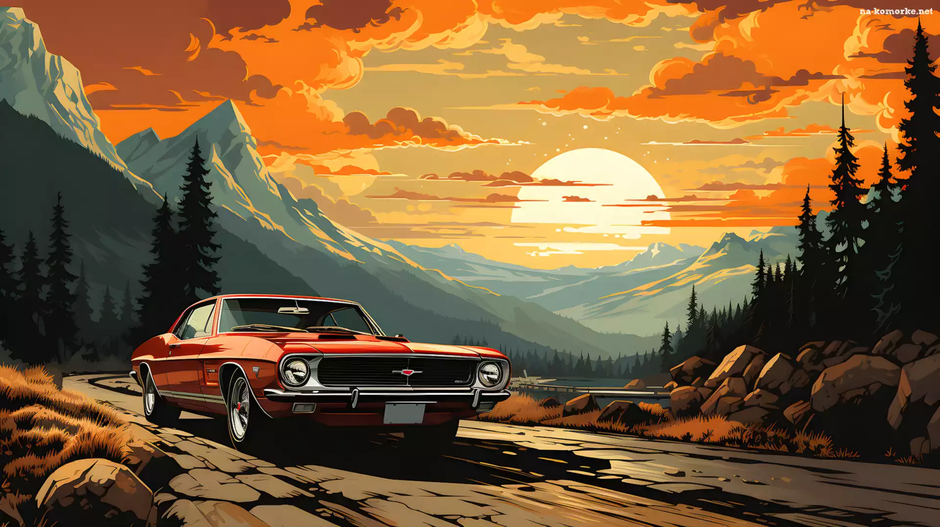 Samochód, Góry, Zachód słońca, Droga, Grafika 2D na Komórkę