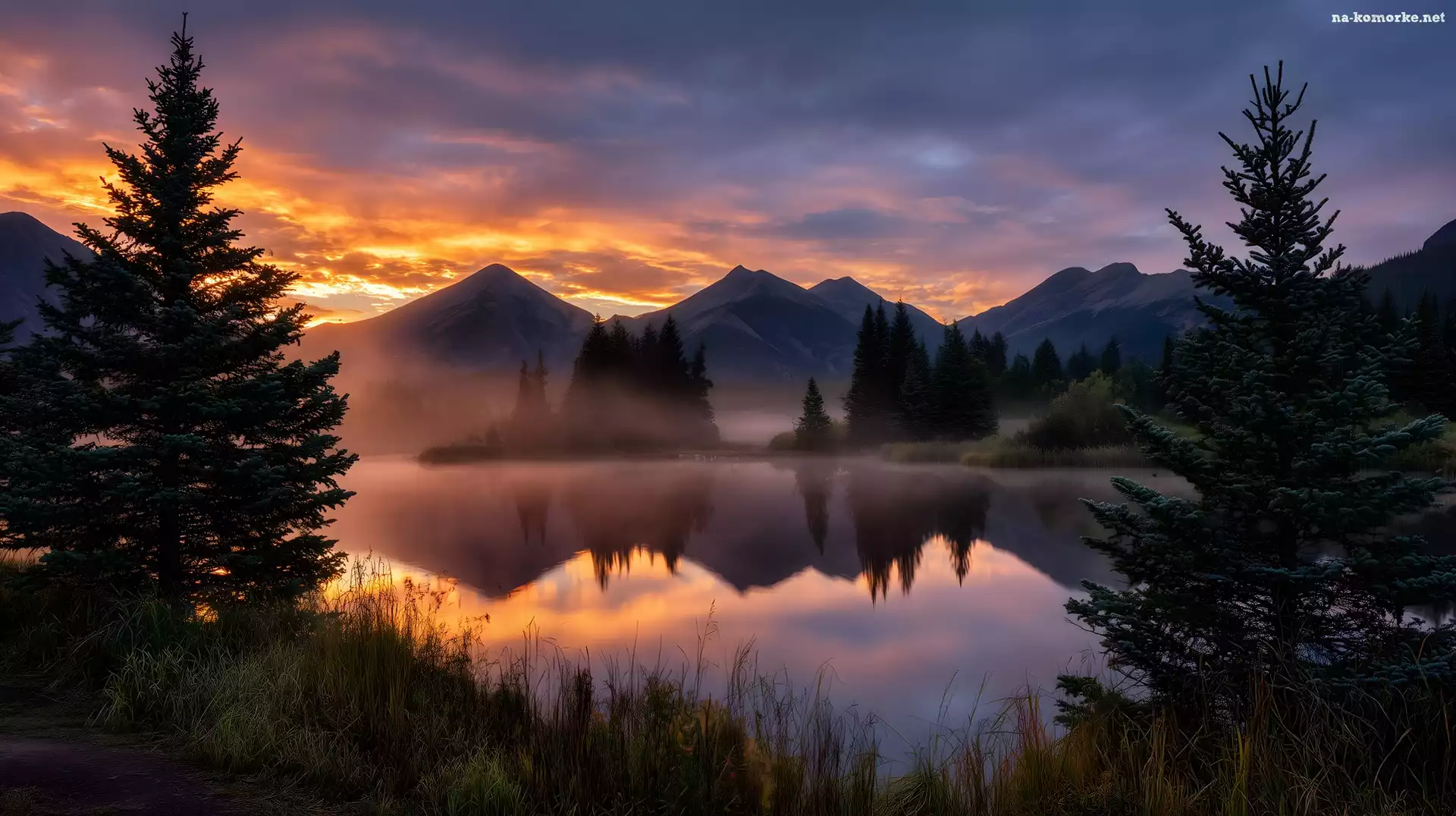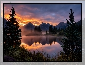 Drzewa, Góry, Zachód słońca, Jezioro, Grafika AI na Komórkę