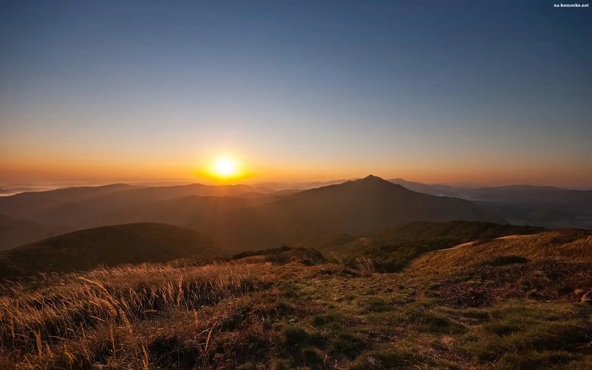 Zachód słońca, Polska, Bieszczady, Połonina Wetlińska, Góry na Komórkę