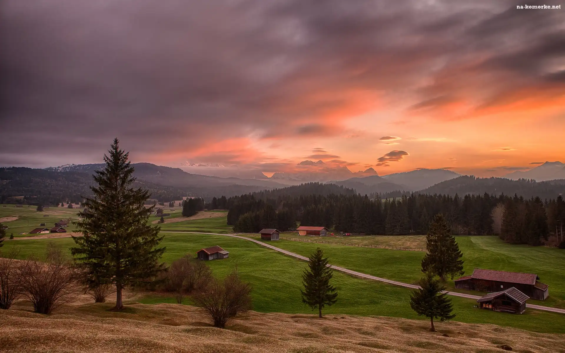 Lasy, Karwendel, Zachód, Drogi, Niemcy, Alpy, Bawaria, Domy, Słońca na Komórkę