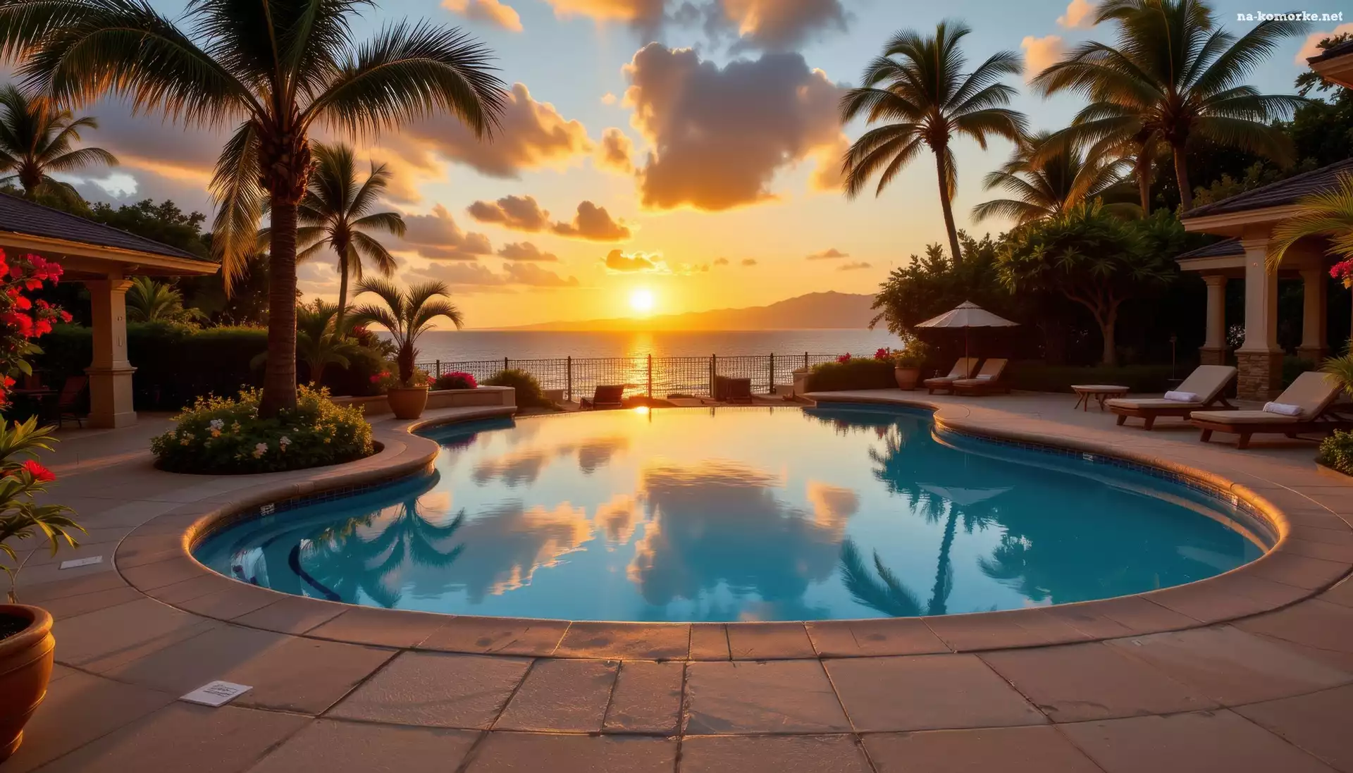 Basen, Morze, Zachód słońca, Palmy, Grafika AI na Komórkę