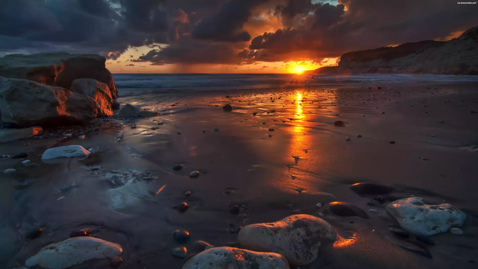 Słońca, Plaża, Morze, Chmury, Zachód, Kamienie na Komórkę